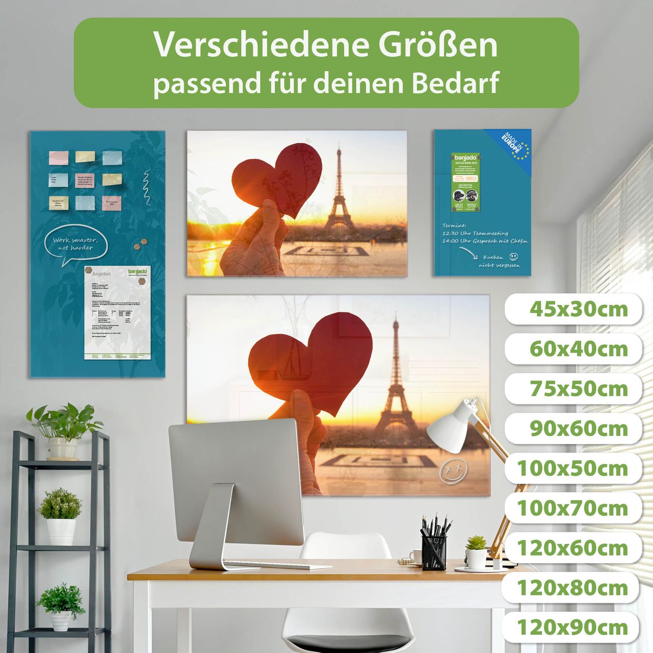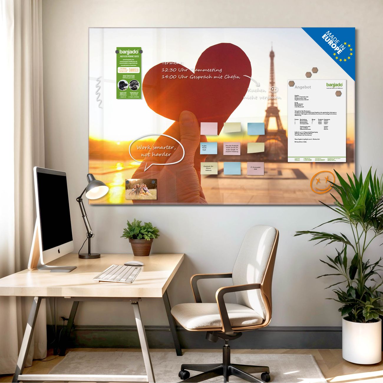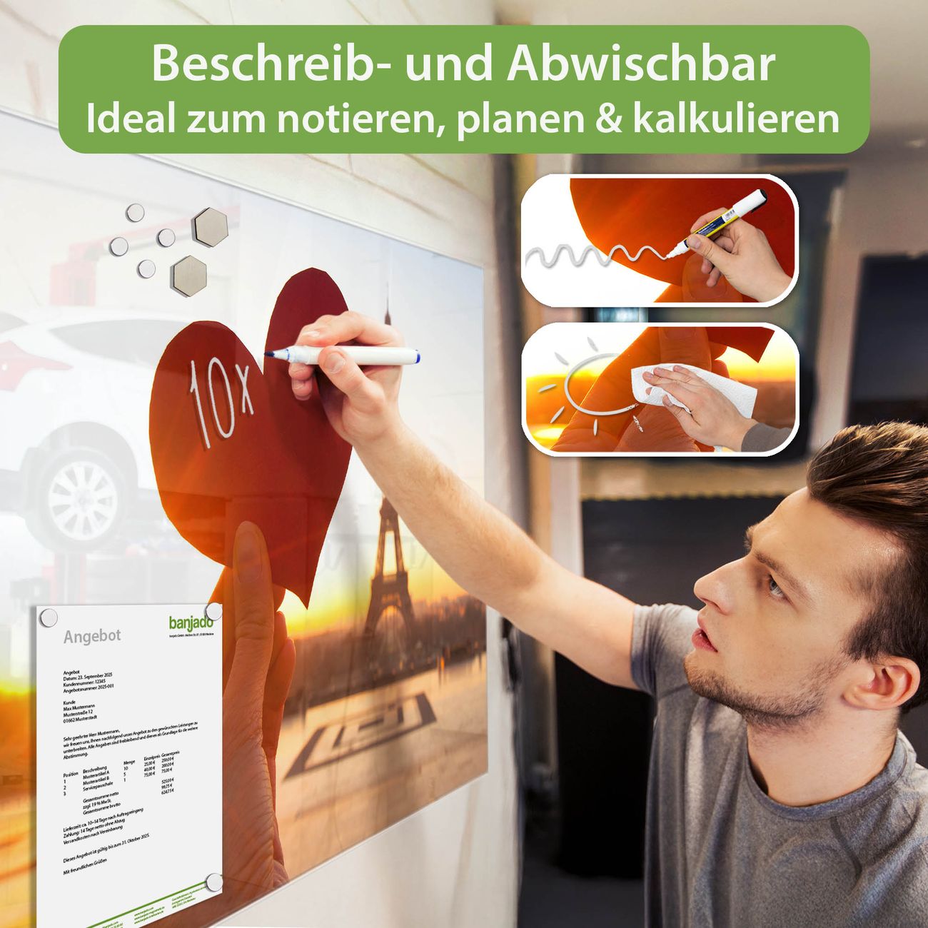 Jede Glas Magnettafel wird in unserer Werkstatt von Hand gefertigt und sorgfältig geprüft. So erhalten Sie ein echtes Qualitätsprodukt, das Funktion und Ästhetik perfekt vereint.?? Warum banjado?