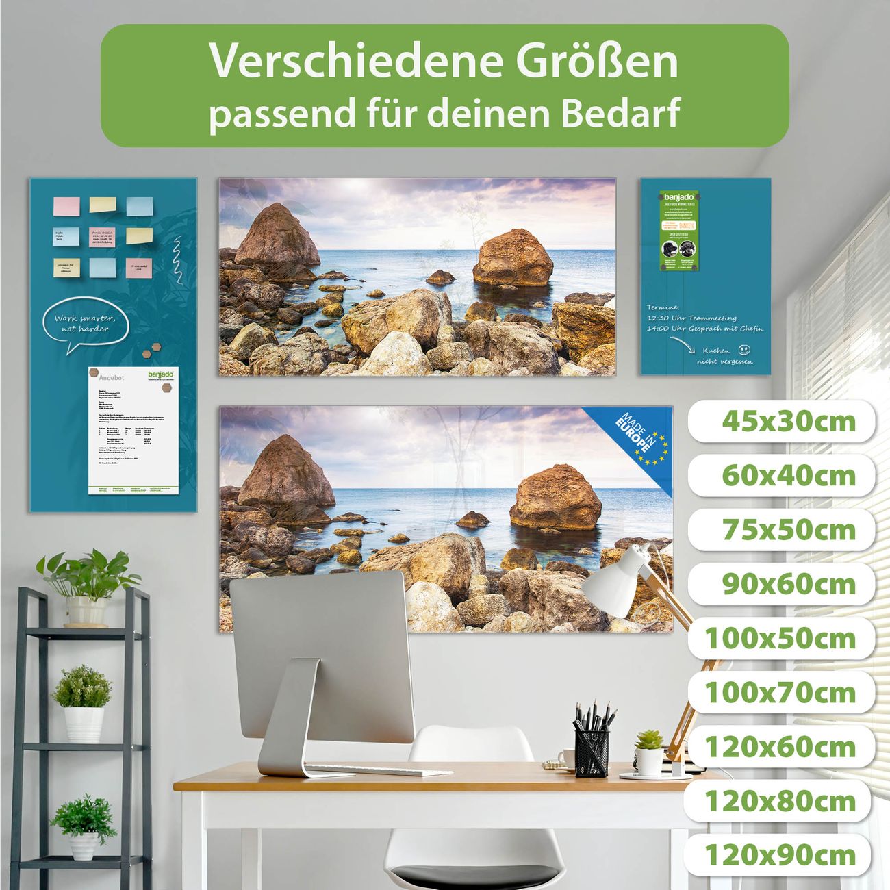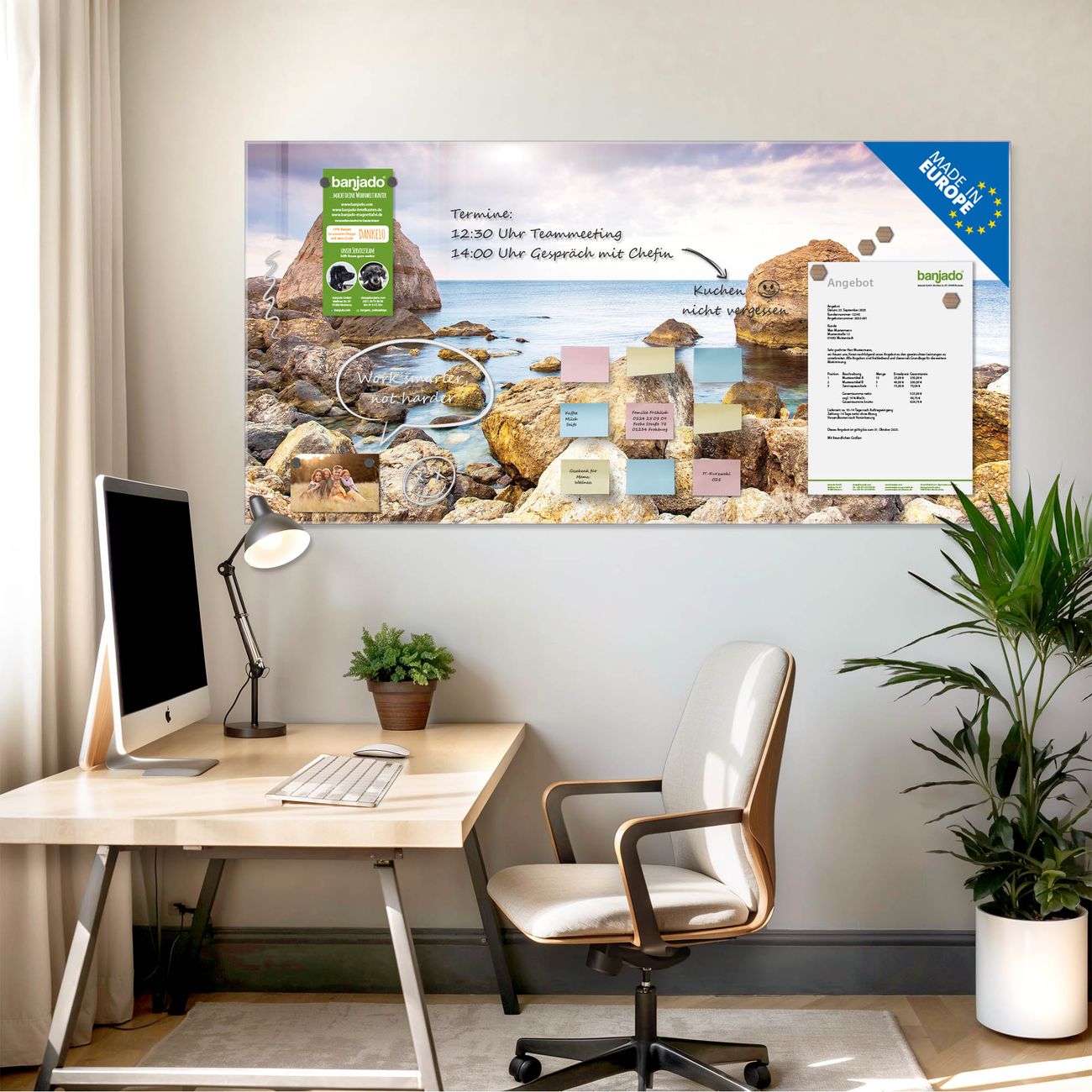 Jede Glas Magnettafel wird in unserer Werkstatt von Hand gefertigt und sorgfältig geprüft. So erhalten Sie ein echtes Qualitätsprodukt, das Funktion und Ästhetik perfekt vereint.?? Warum banjado?