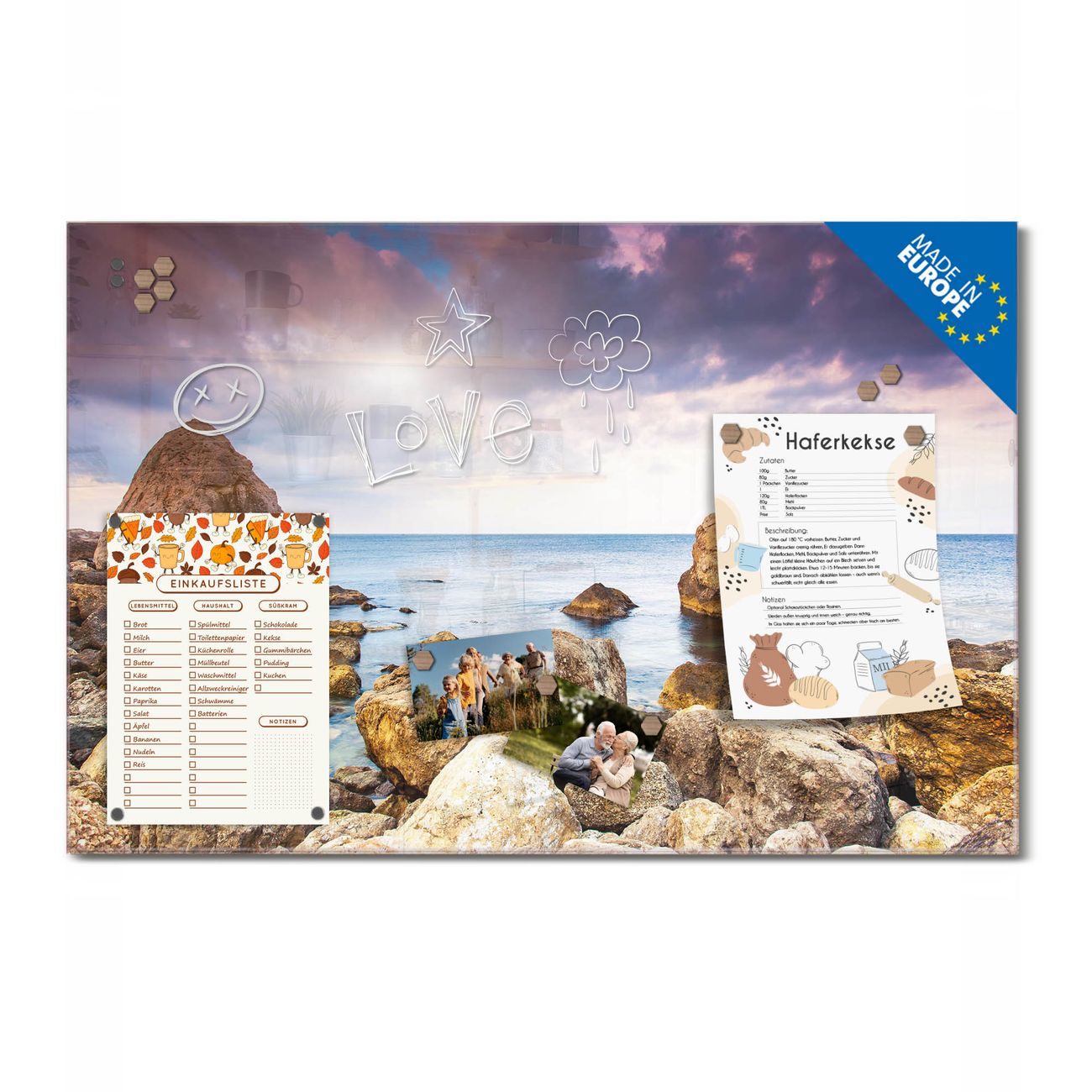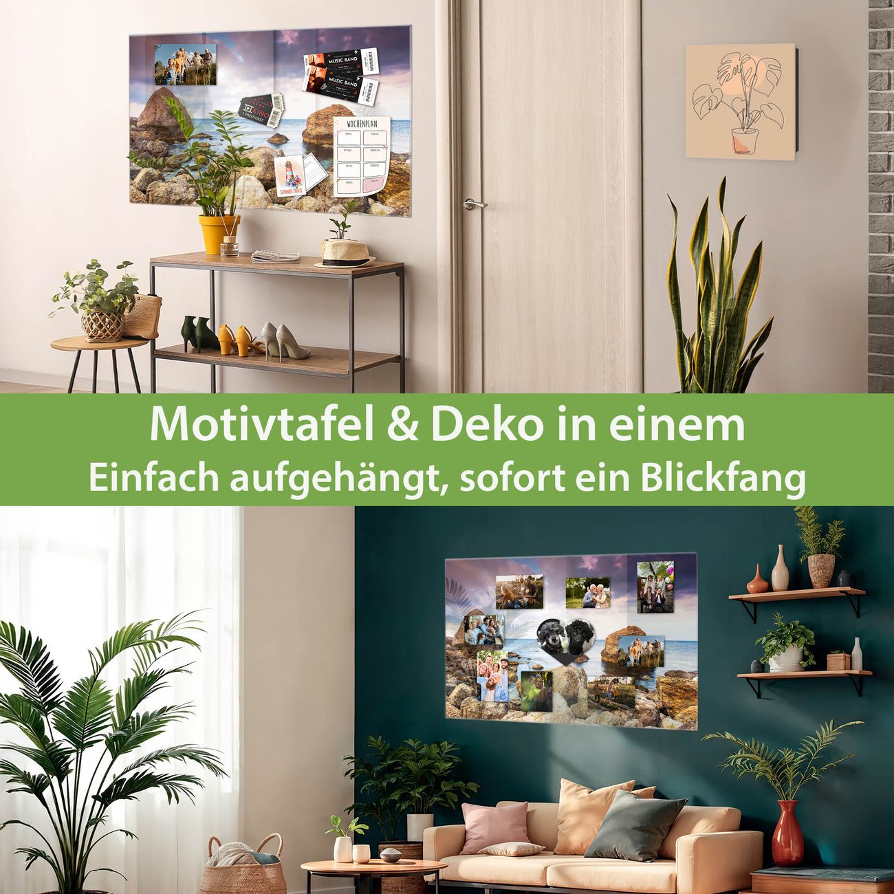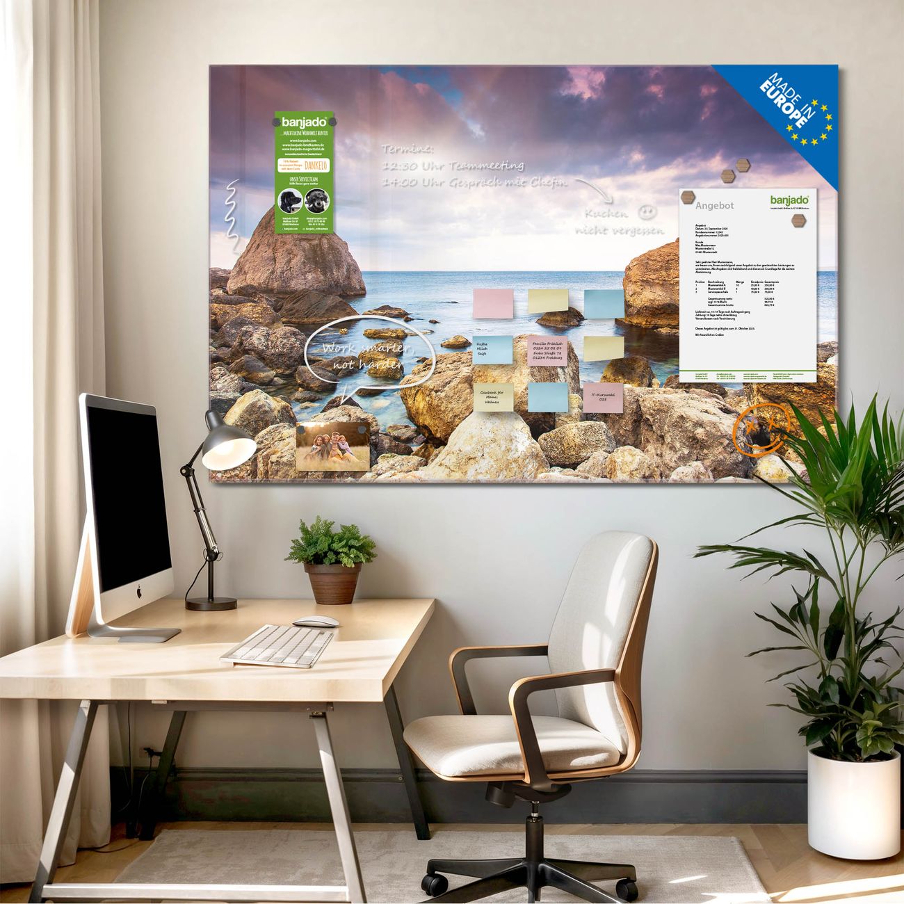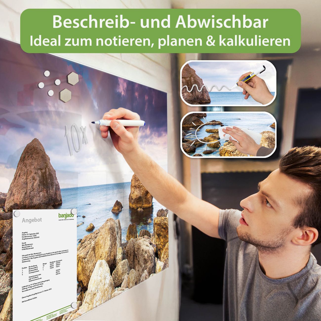 Die banjado Glas Magnettafel mit dem Motiv Motiv Steinbucht verbindet Funktionalität mit Stil. Sie ersetzt das Zettelchaos durch klare Strukturen und bringt dabei eine warme, natürliche Atmosphäre in Ihr Zuhause. Ob im Büro, in der Küche oder im Eingangsbereich - dieses Design-Board zieht Blicke an und sorgt für Ordnung mit Charakter.