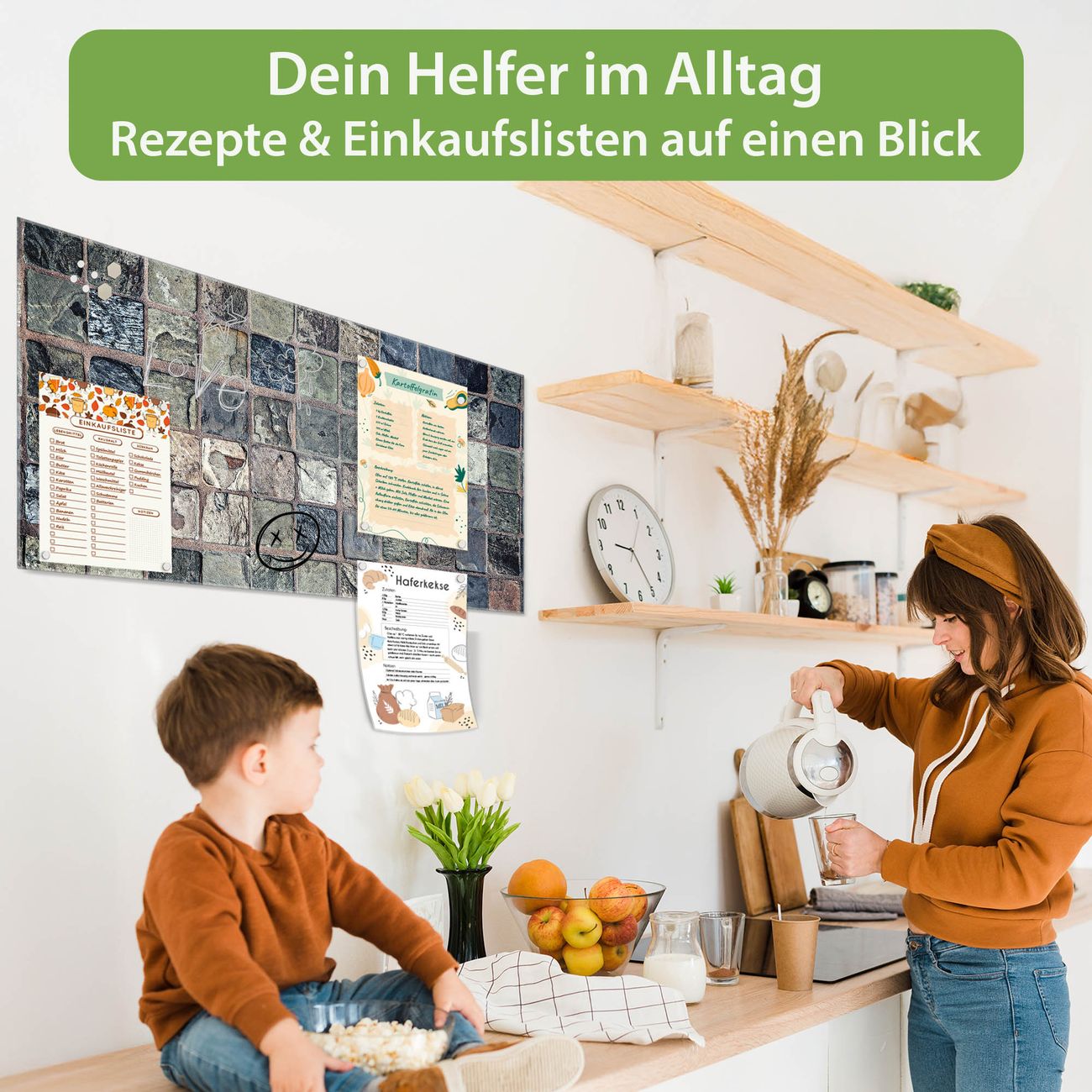 Ein Stück Design, das Ihren Alltag organisiert. Schreiben, heften, inspirieren - alles an einem Ort. Qualität, die man spürt. Montage leicht gemacht. Handwerk mit Herz - veredelt in Sachsen. Einzigartiges Design mit Motiv Motiv Steinfliesen Beschreibbare Glasoberfläche, leicht zu reinigen Starke Magnetkraft durch Stahlrückwand Inklusive 4 Neodym-Magneten Flexible Montageoptionen Handveredelt in Sachsen - Qualität, die bleibt