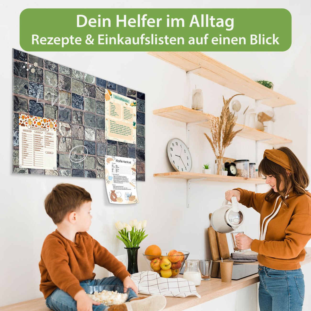 Ein Stück Design, das Ihren Alltag organisiert. Schreiben, heften, inspirieren - alles an einem Ort. Qualität, die man spürt. Montage leicht gemacht. Handwerk mit Herz - veredelt in Sachsen. Einzigartiges Design mit Motiv Motiv Steinfliesen Beschreibbare Glasoberfläche, leicht zu reinigen Starke Magnetkraft durch Stahlrückwand Inklusive 4 Neodym-Magneten Flexible Montageoptionen Handveredelt in Sachsen - Qualität, die bleibt