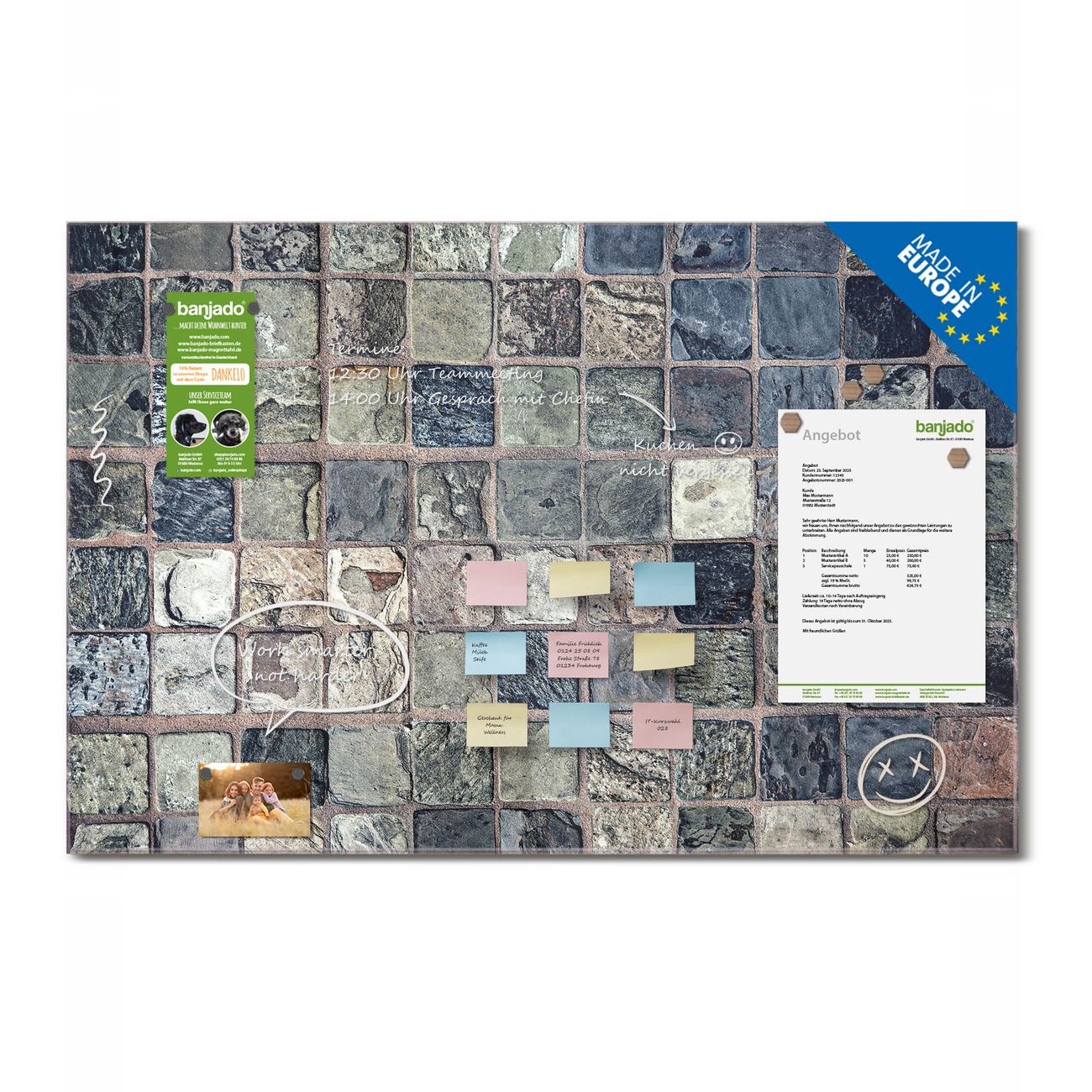 Jede Glas Magnettafel wird in unserer Werkstatt von Hand gefertigt und sorgfältig geprüft. So erhalten Sie ein echtes Qualitätsprodukt, das Funktion und Ästhetik perfekt vereint.?? Warum banjado?