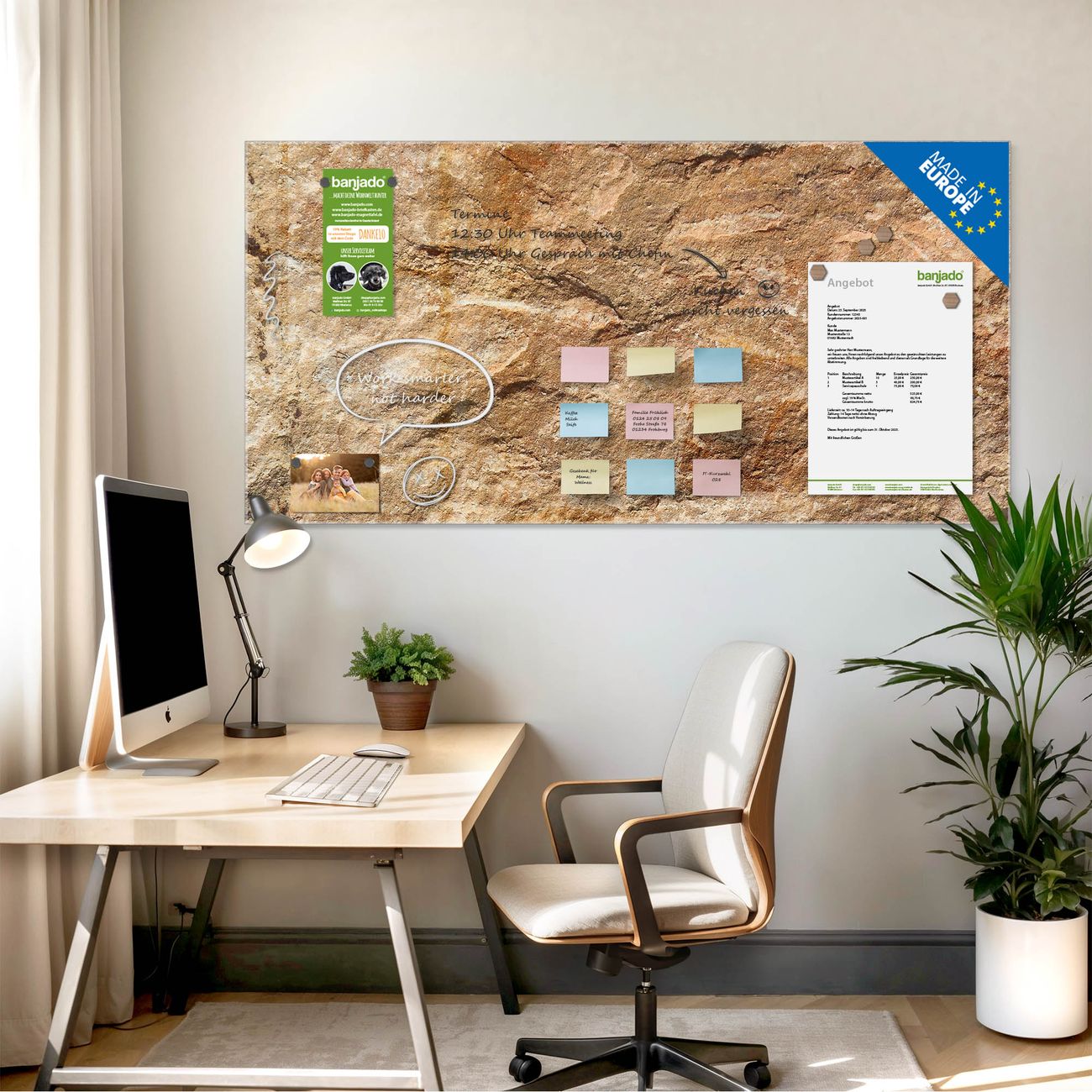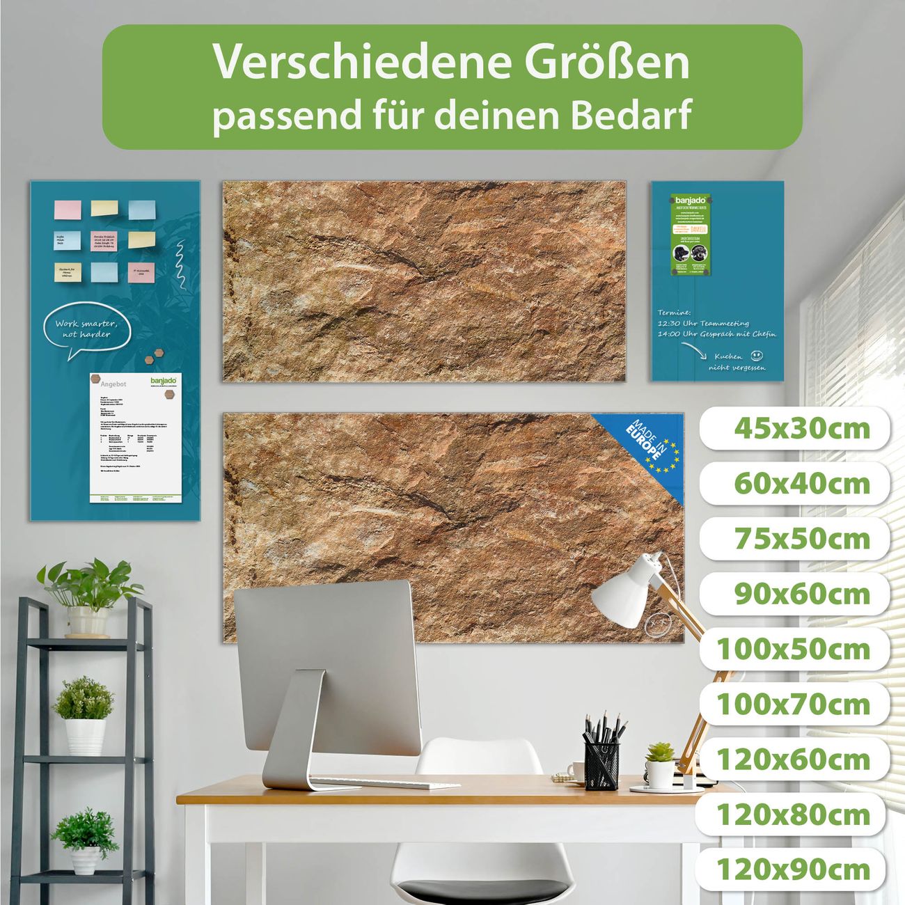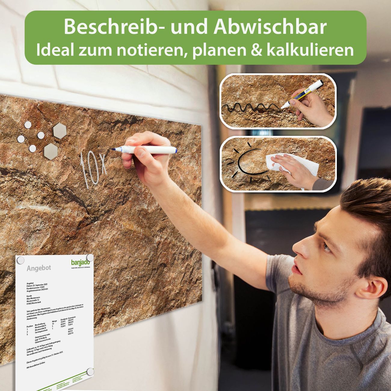 Jede Glas Magnettafel wird in unserer Werkstatt von Hand gefertigt und sorgfältig geprüft. So erhalten Sie ein echtes Qualitätsprodukt, das Funktion und Ästhetik perfekt vereint.?? Warum banjado?