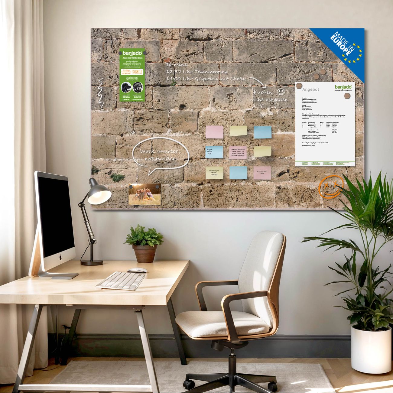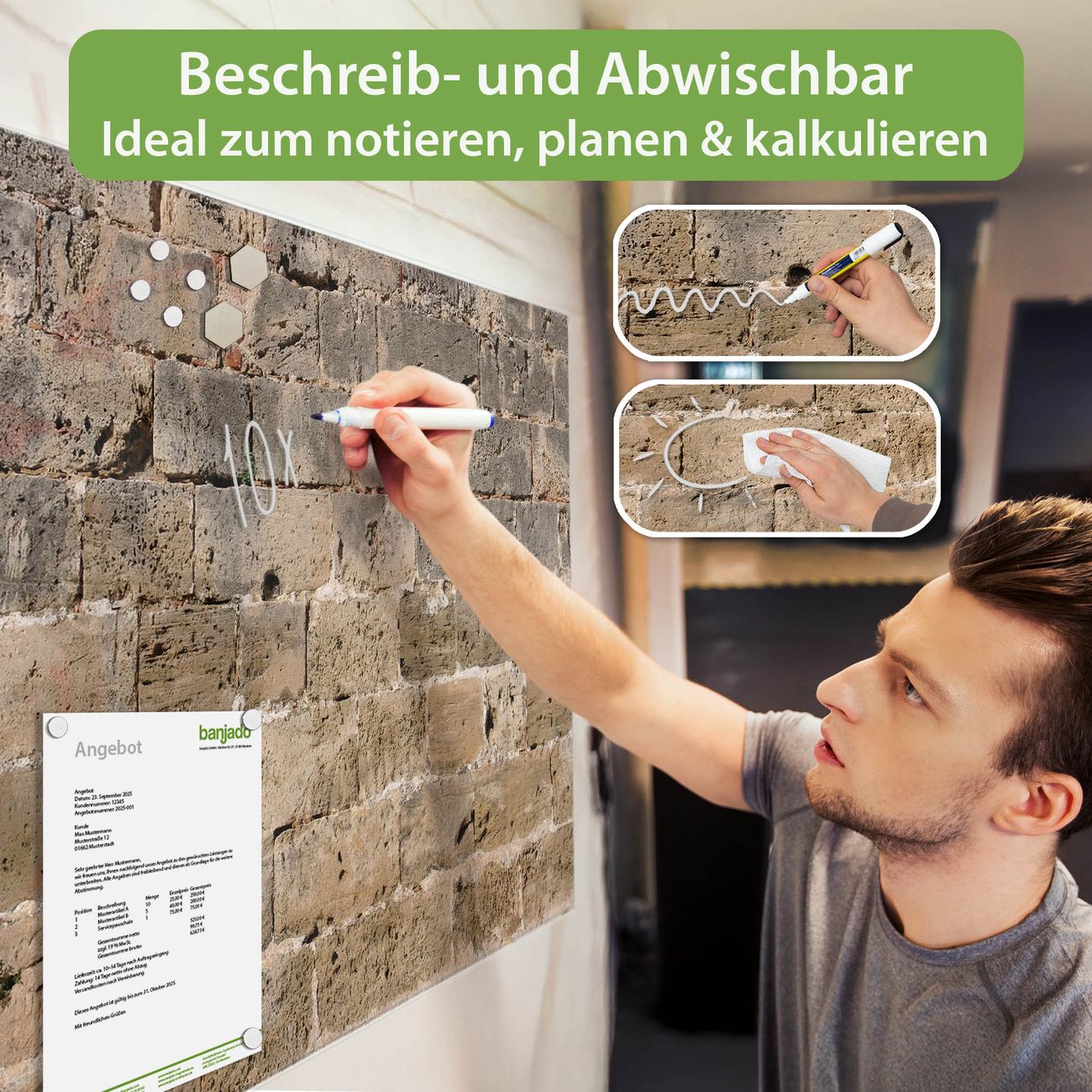 Jede Glas Magnettafel wird in unserer Werkstatt von Hand gefertigt und sorgfältig geprüft. So erhalten Sie ein echtes Qualitätsprodukt, das Funktion und Ästhetik perfekt vereint.?? Warum banjado?