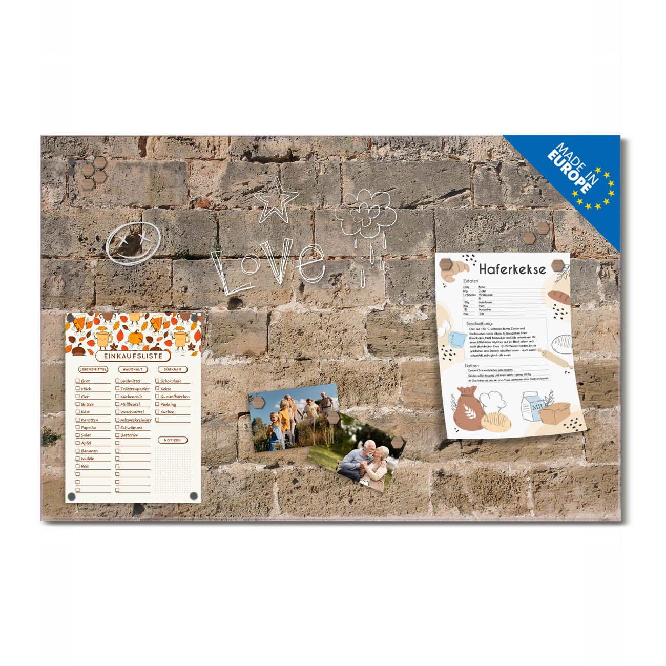 Ein Stück Design, das Ihren Alltag organisiert. Schreiben, heften, inspirieren - alles an einem Ort. Qualität, die man spürt. Montage leicht gemacht. Handwerk mit Herz - veredelt in Sachsen. Einzigartiges Design mit Motiv Motiv Steinwand Antik Beschreibbare Glasoberfläche, leicht zu reinigen Starke Magnetkraft durch Stahlrückwand Inklusive 4 Neodym-Magneten Flexible Montageoptionen Handveredelt in Sachsen - Qualität, die bleibt