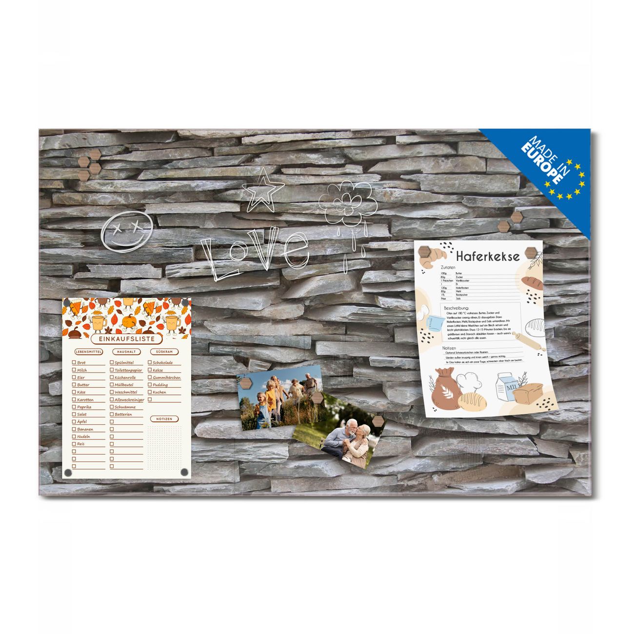 Ein Stück Design, das Ihren Alltag organisiert. Schreiben, heften, inspirieren - alles an einem Ort. Qualität, die man spürt. Montage leicht gemacht. Handwerk mit Herz - veredelt in Sachsen. Einzigartiges Design mit Motiv Motiv Steinwand Beschreibbare Glasoberfläche, leicht zu reinigen Starke Magnetkraft durch Stahlrückwand Inklusive 4 Neodym-Magneten Flexible Montageoptionen Handveredelt in Sachsen - Qualität, die bleibt