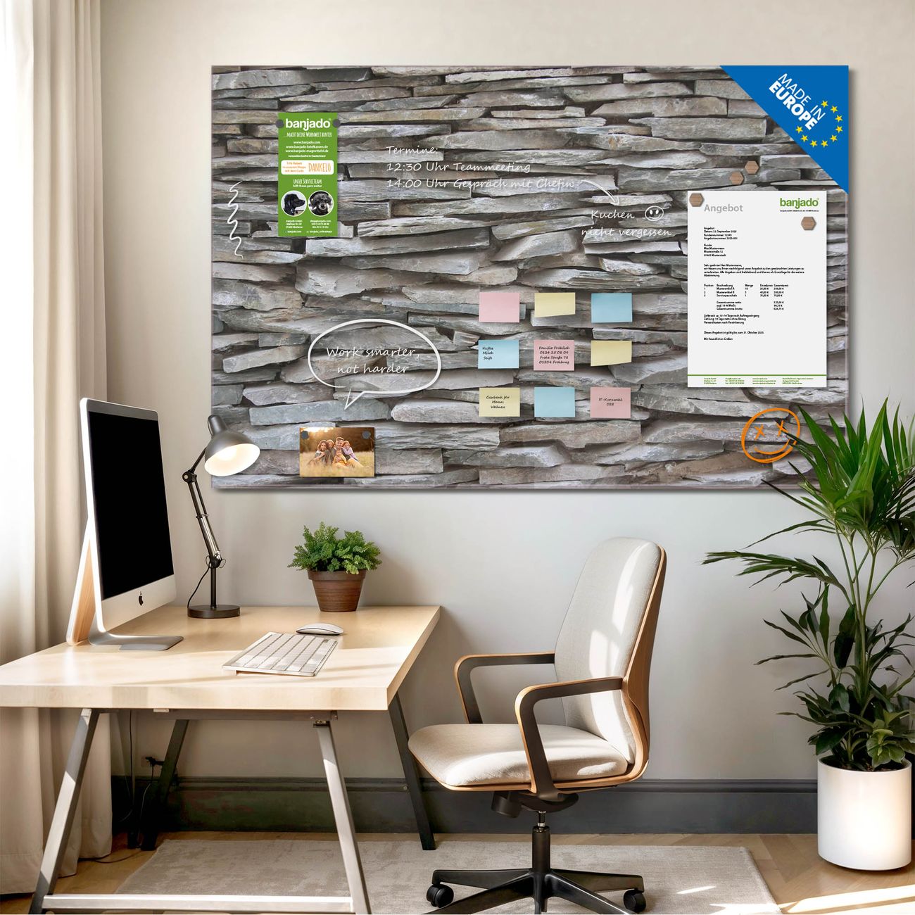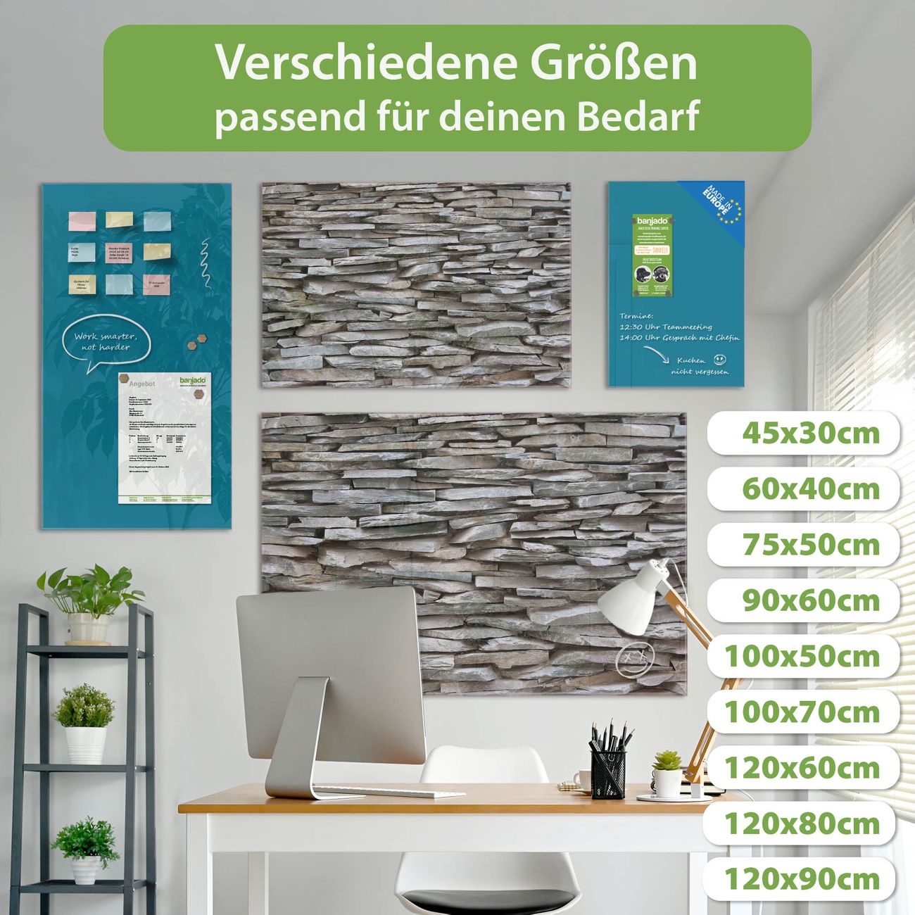 Jede Glas Magnettafel wird in unserer Werkstatt von Hand gefertigt und sorgfältig geprüft. So erhalten Sie ein echtes Qualitätsprodukt, das Funktion und Ästhetik perfekt vereint.?? Warum banjado?