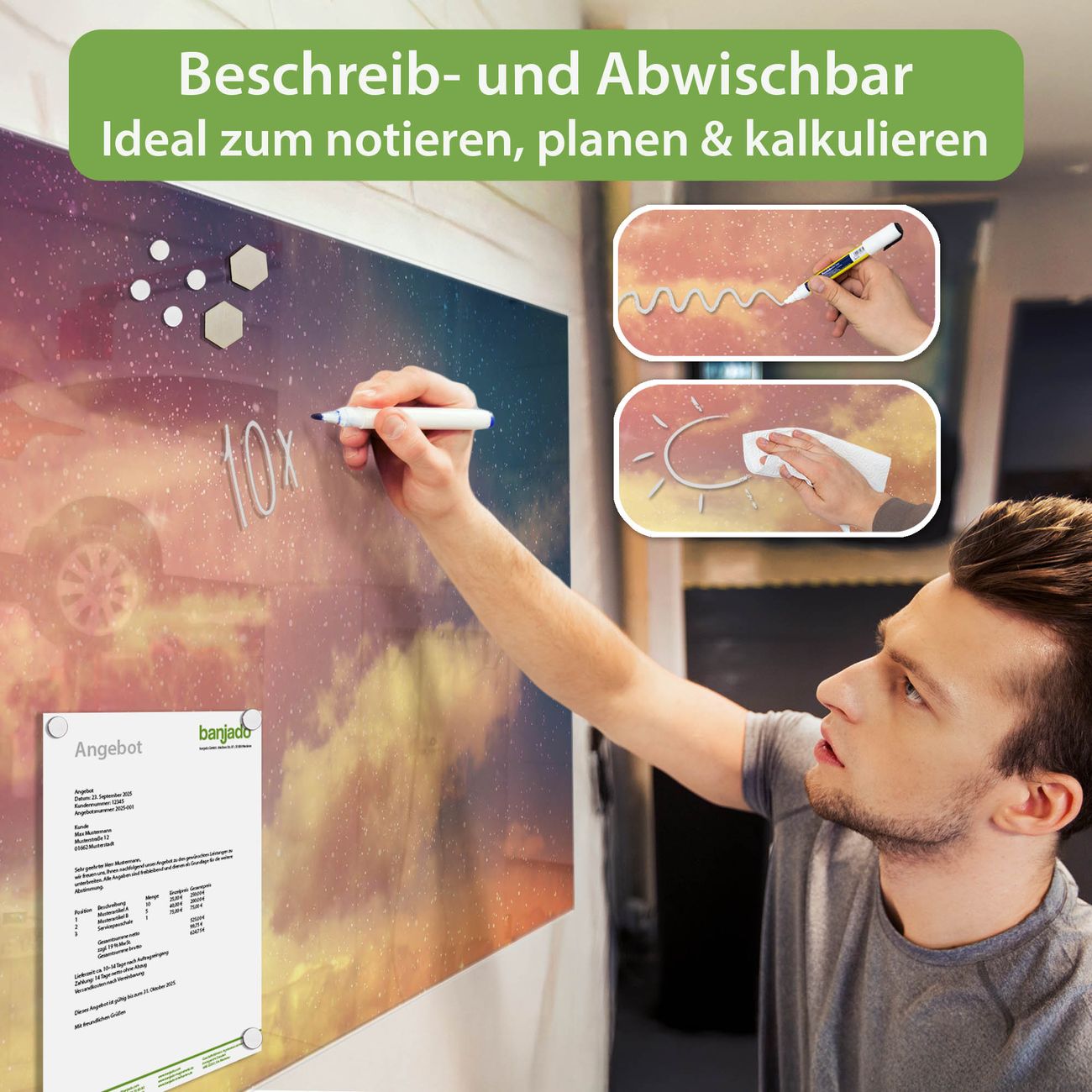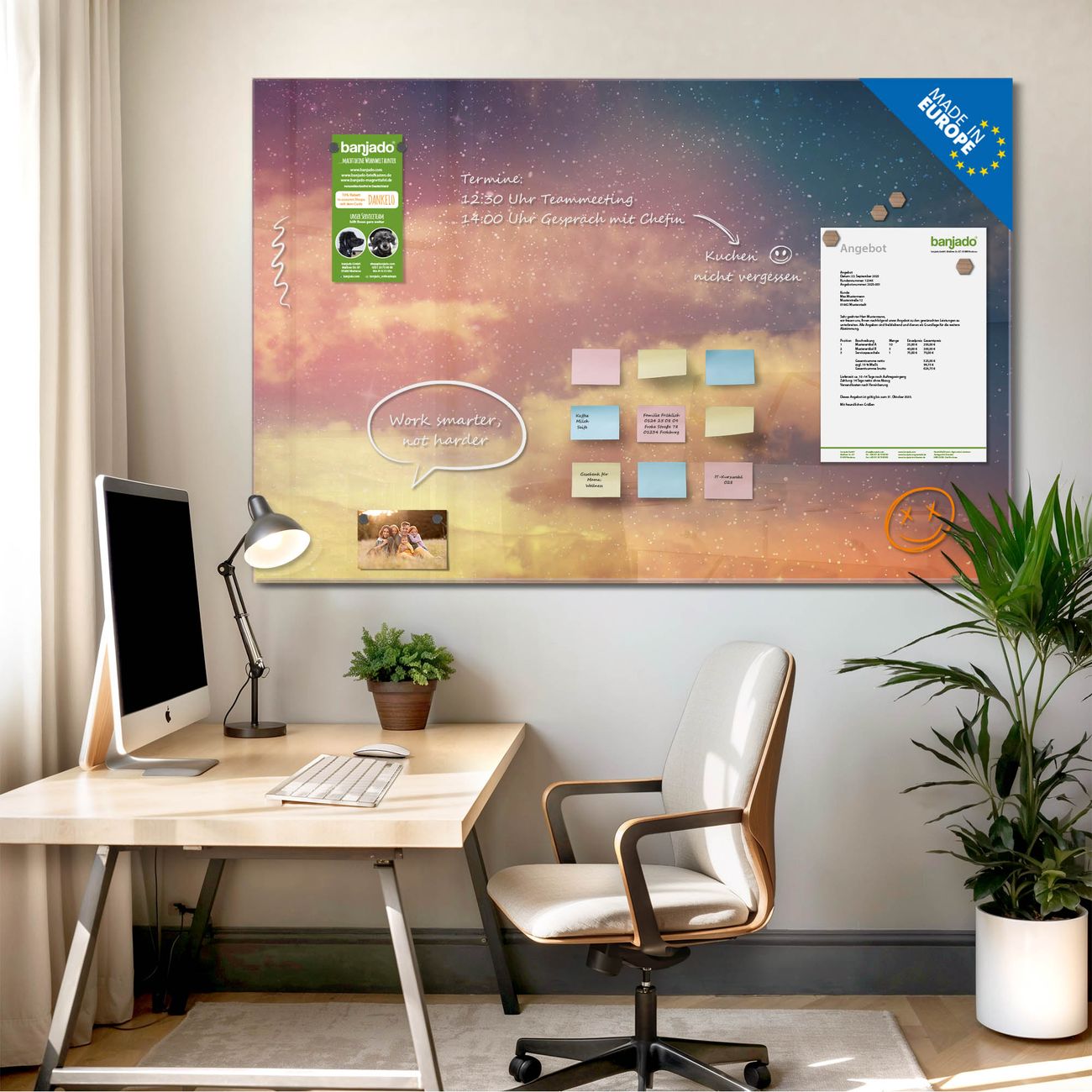Die banjado Glas Magnettafel mit dem Motiv Motiv Sternenhimmel verbindet Funktionalität mit Stil. Sie ersetzt das Zettelchaos durch klare Strukturen und bringt dabei eine warme, natürliche Atmosphäre in Ihr Zuhause. Ob im Büro, in der Küche oder im Eingangsbereich - dieses Design-Board zieht Blicke an und sorgt für Ordnung mit Charakter.