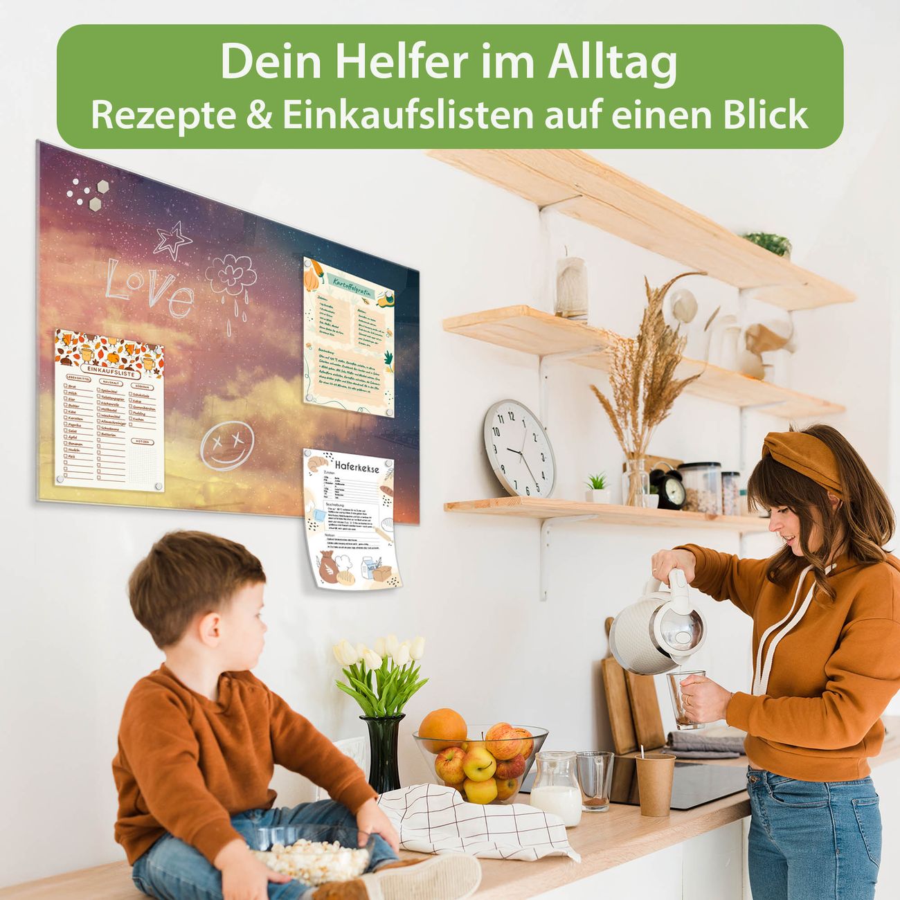 Ein Stück Design, das Ihren Alltag organisiert. Schreiben, heften, inspirieren - alles an einem Ort. Qualität, die man spürt. Montage leicht gemacht. Handwerk mit Herz - veredelt in Sachsen. Einzigartiges Design mit Motiv Motiv Sternenhimmel Beschreibbare Glasoberfläche, leicht zu reinigen Starke Magnetkraft durch Stahlrückwand Inklusive 4 Neodym-Magneten Flexible Montageoptionen Handveredelt in Sachsen - Qualität, die bleibt
