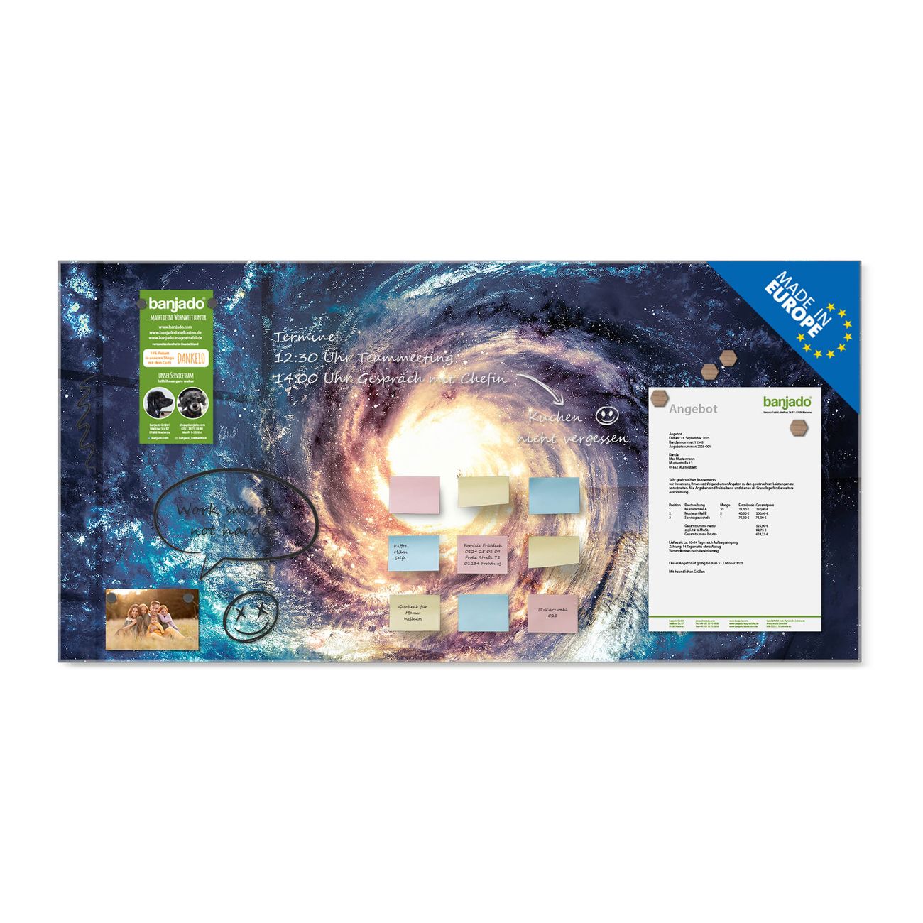 Ein Stück Design, das Ihren Alltag organisiert. Schreiben, heften, inspirieren - alles an einem Ort. Qualität, die man spürt. Montage leicht gemacht. Handwerk mit Herz - veredelt in Sachsen. Einzigartiges Design mit Motiv Motiv Sternenwirbel Beschreibbare Glasoberfläche, leicht zu reinigen Starke Magnetkraft durch Stahlrückwand Inklusive 4 Neodym-Magneten Flexible Montageoptionen Handveredelt in Sachsen - Qualität, die bleibt