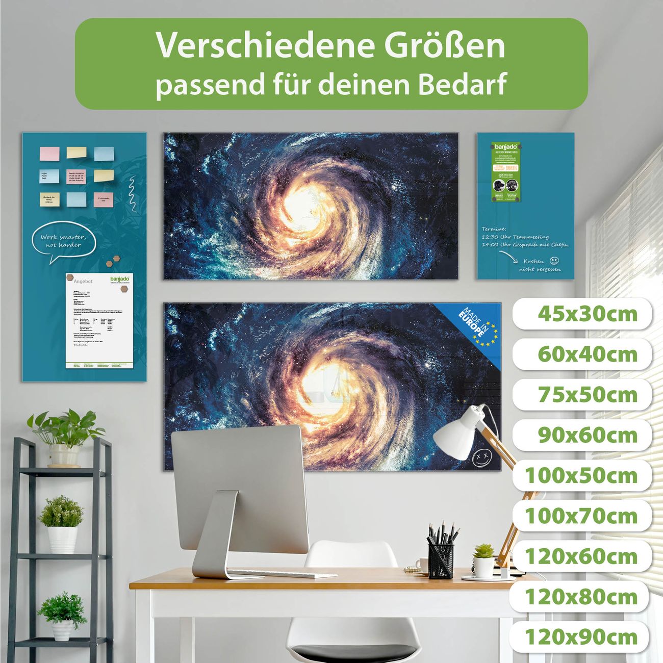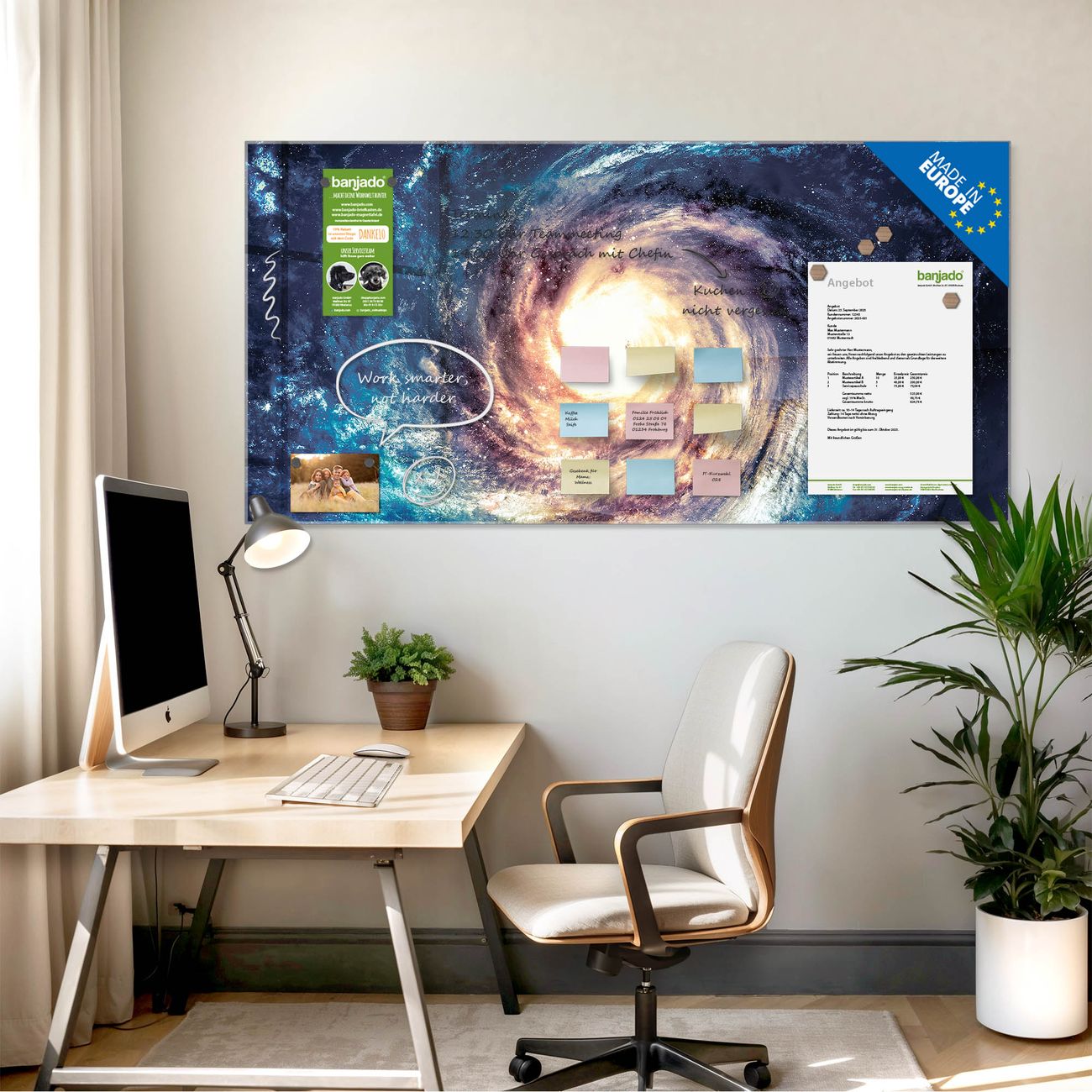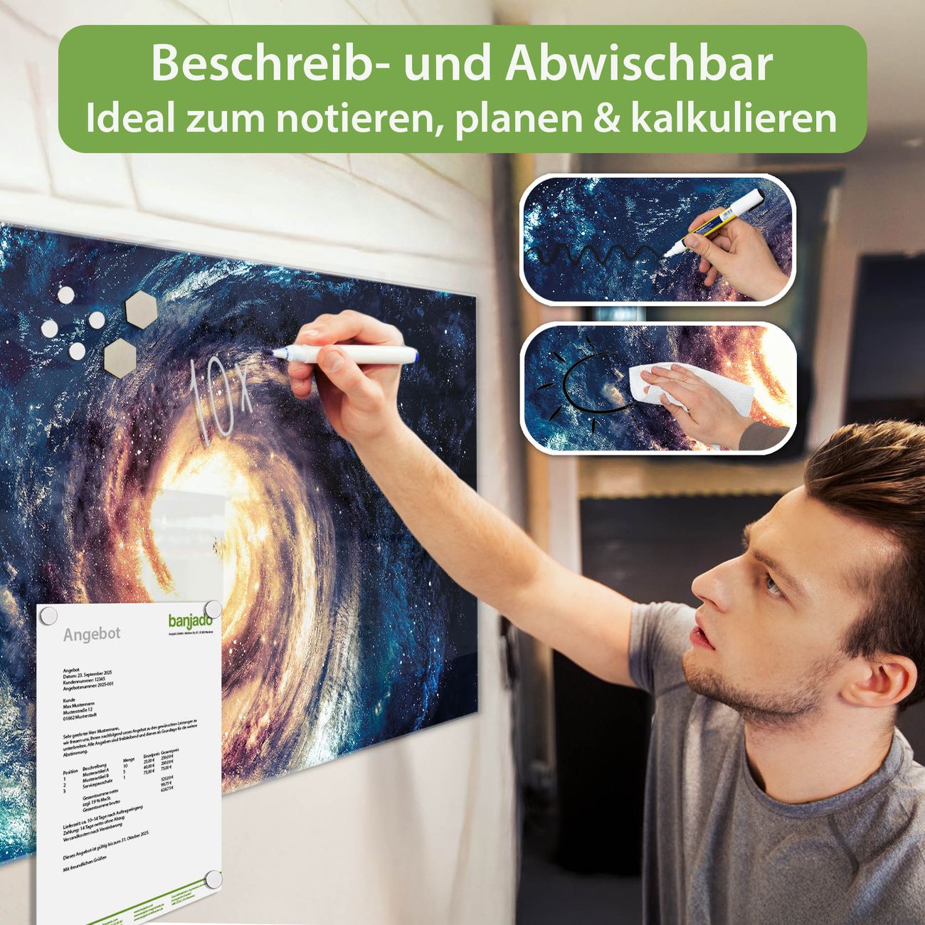 Jede Glas Magnettafel wird in unserer Werkstatt von Hand gefertigt und sorgfältig geprüft. So erhalten Sie ein echtes Qualitätsprodukt, das Funktion und Ästhetik perfekt vereint.?? Warum banjado?
