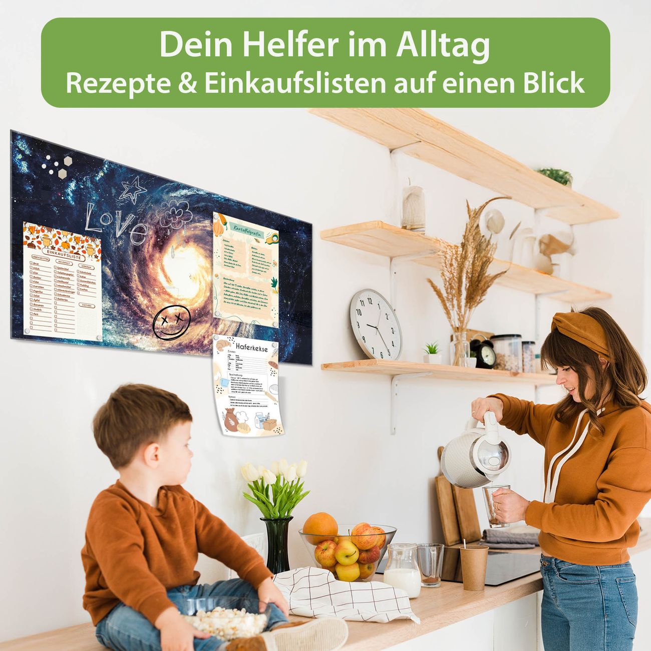 Auf der glatten Glasoberfläche lassen sich Termine, Rezepte oder Notizen ganz einfach mit Kreidestiften festhalten und rückstandslos entfernen. Starke Neodym-Magnete halten Ihre wichtigsten Erinnerungen sicher an Ort und Stelle. So entsteht Ihre ganz persönliche Ideenwand - jeden Tag neu.