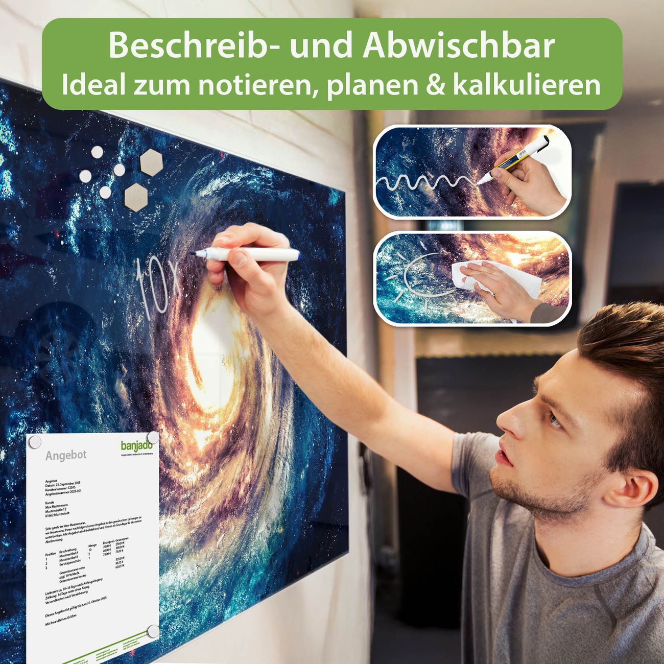 Jede Glas Magnettafel wird in unserer Werkstatt von Hand gefertigt und sorgfältig geprüft. So erhalten Sie ein echtes Qualitätsprodukt, das Funktion und Ästhetik perfekt vereint.?? Warum banjado?