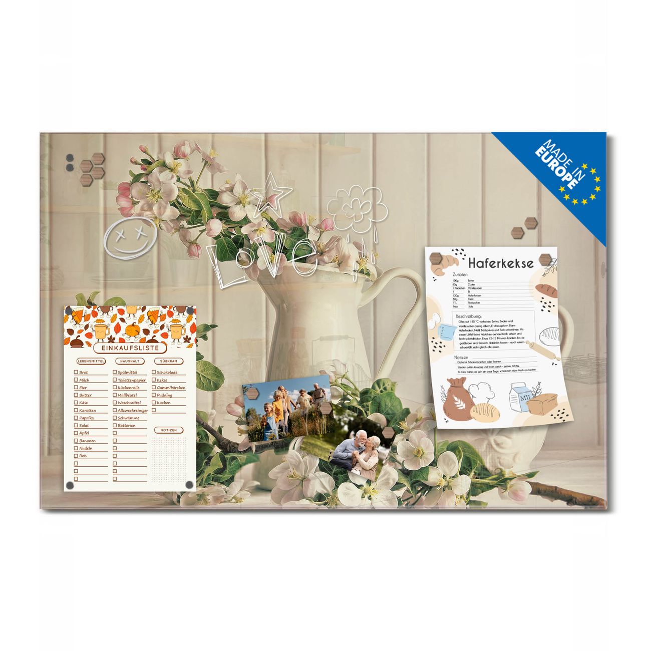 Ein Stück Design, das Ihren Alltag organisiert. Schreiben, heften, inspirieren - alles an einem Ort. Qualität, die man spürt. Montage leicht gemacht. Handwerk mit Herz - veredelt in Sachsen. Einzigartiges Design mit Motiv Motiv Stillleben Kirschblüten Beschreibbare Glasoberfläche, leicht zu reinigen Starke Magnetkraft durch Stahlrückwand Inklusive 4 Neodym-Magneten Flexible Montageoptionen Handveredelt in Sachsen - Qualität, die bleibt