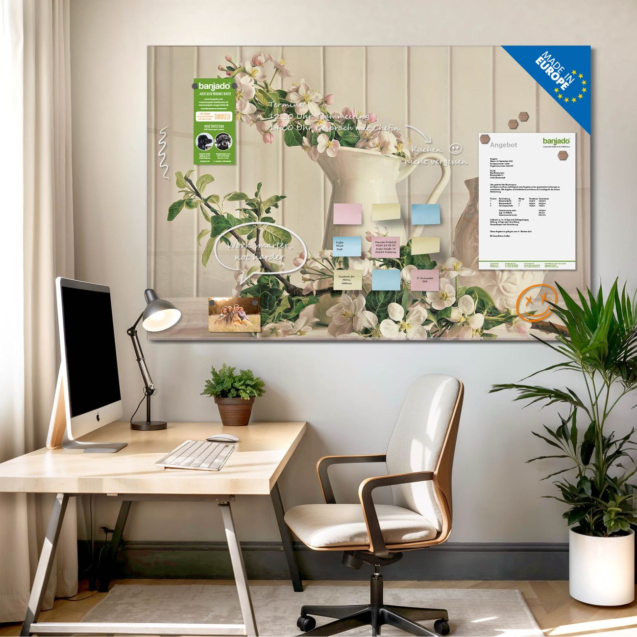 Jede Glas Magnettafel wird in unserer Werkstatt von Hand gefertigt und sorgfältig geprüft. So erhalten Sie ein echtes Qualitätsprodukt, das Funktion und Ästhetik perfekt vereint.?? Warum banjado?