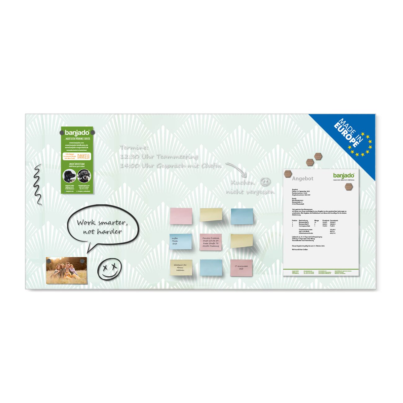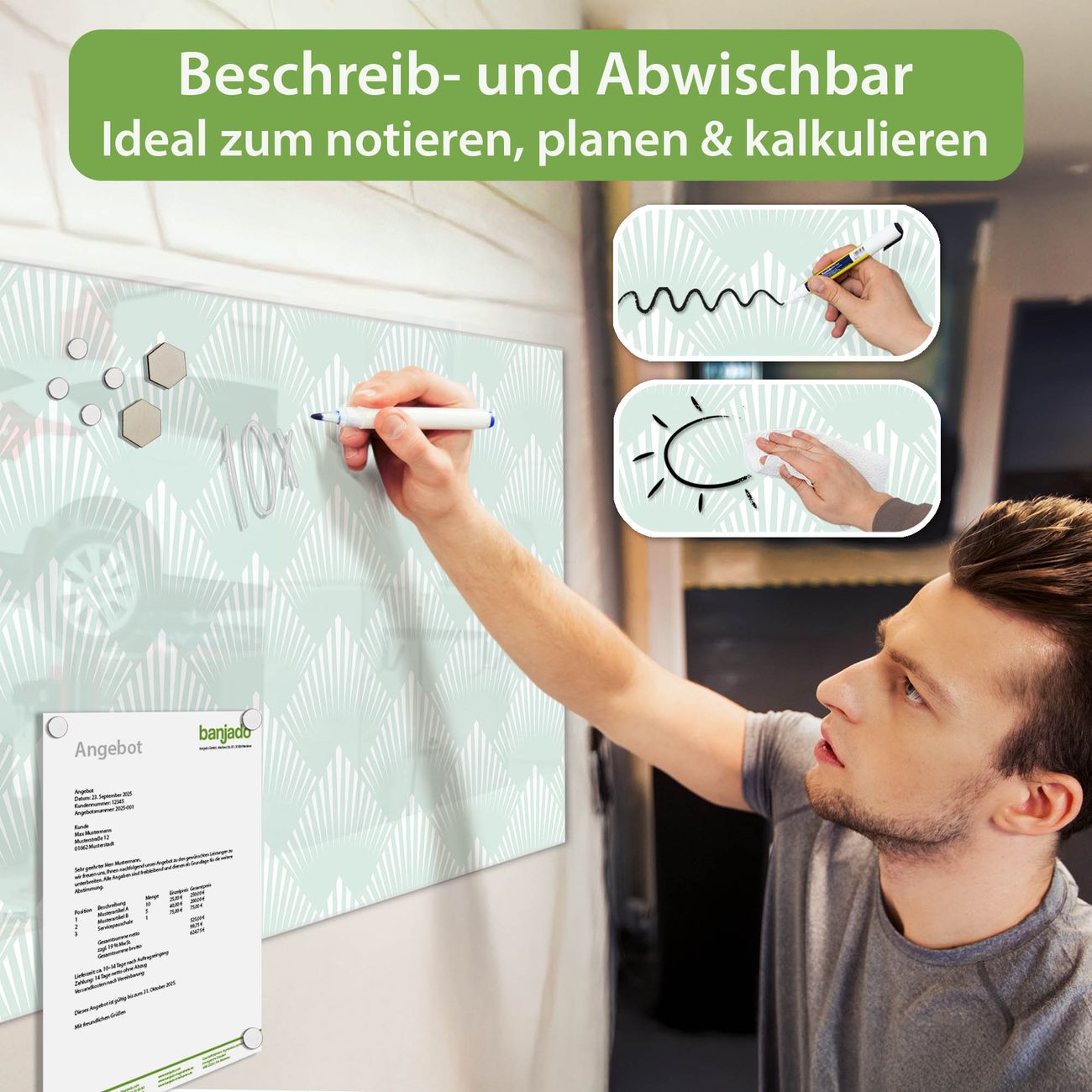 Jede Glas Magnettafel wird in unserer Werkstatt von Hand gefertigt und sorgfältig geprüft. So erhalten Sie ein echtes Qualitätsprodukt, das Funktion und Ästhetik perfekt vereint.?? Warum banjado?