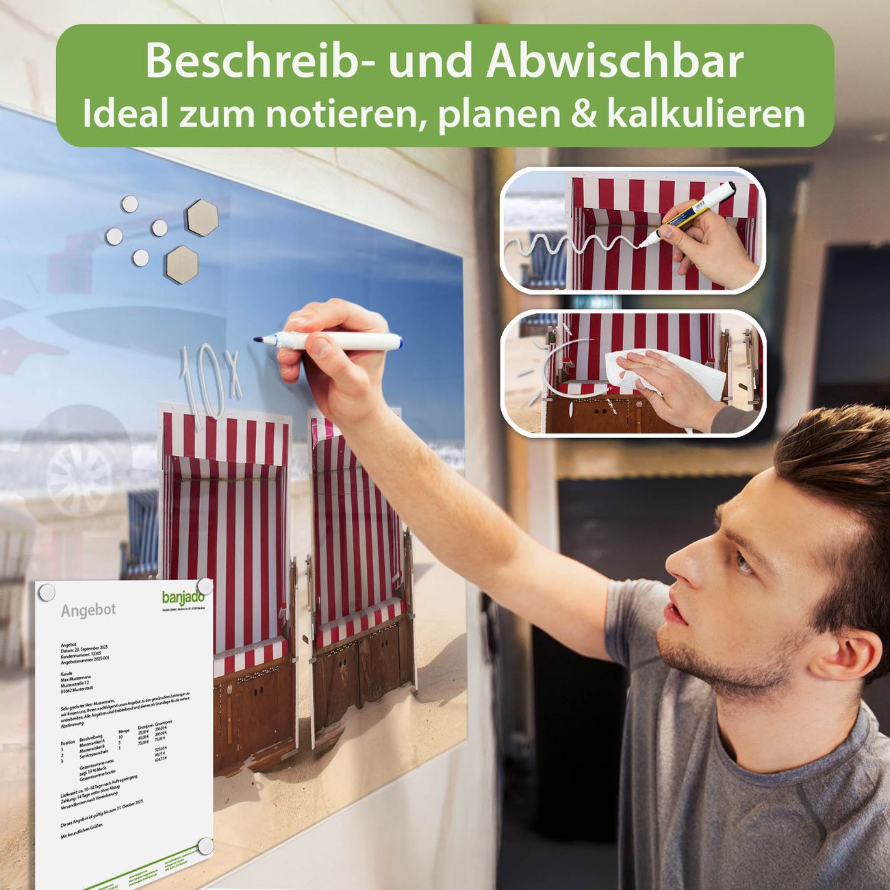 Die banjado Glas Magnettafel mit dem Motiv Motiv Strandkörbe verbindet Funktionalität mit Stil. Sie ersetzt das Zettelchaos durch klare Strukturen und bringt dabei eine warme, natürliche Atmosphäre in Ihr Zuhause. Ob im Büro, in der Küche oder im Eingangsbereich - dieses Design-Board zieht Blicke an und sorgt für Ordnung mit Charakter.