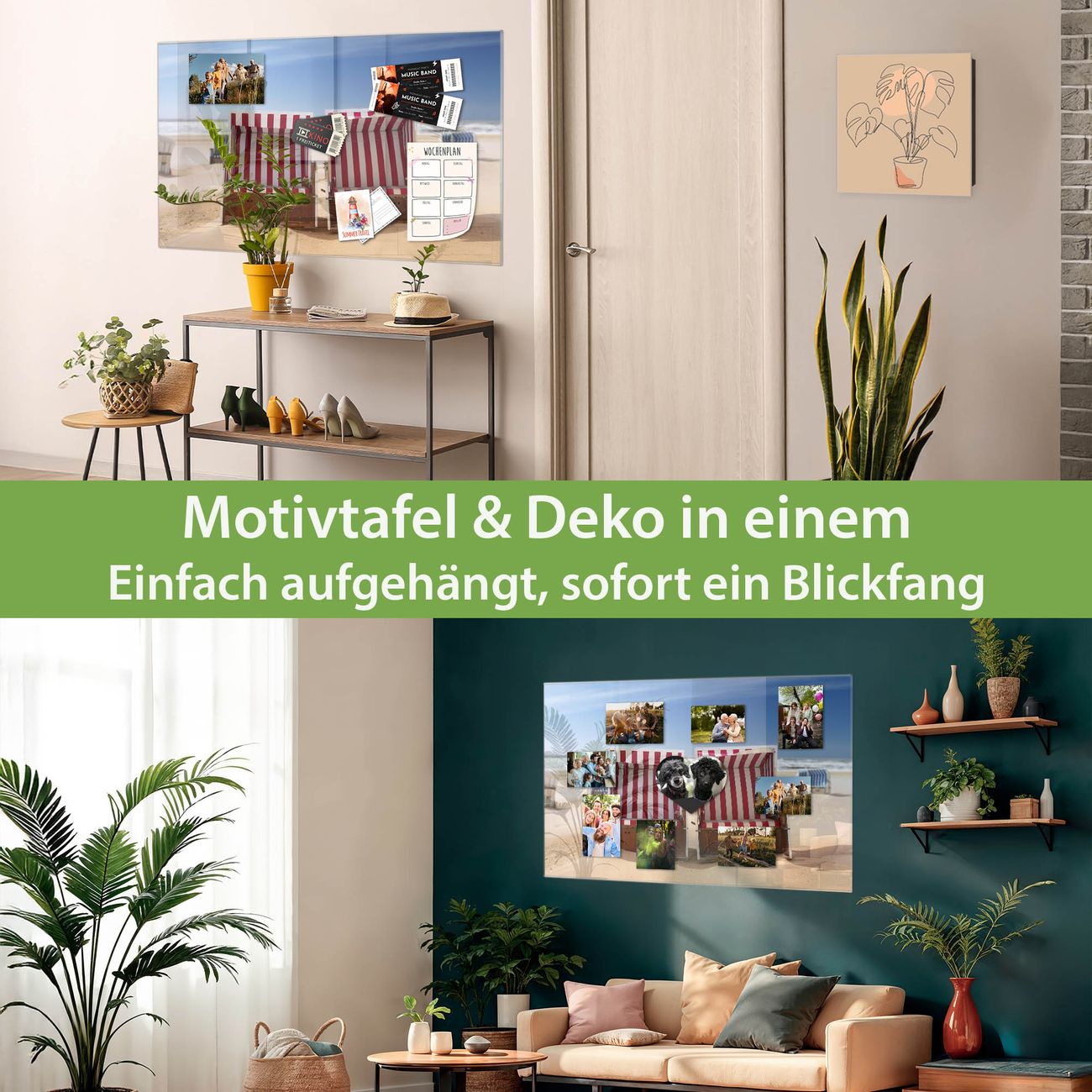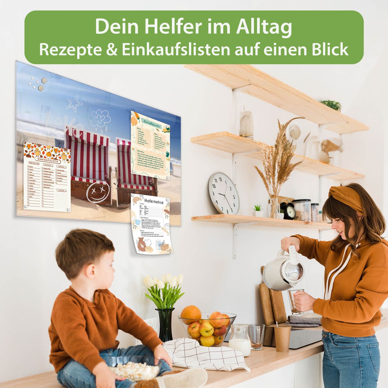 Ein Stück Design, das Ihren Alltag organisiert. Schreiben, heften, inspirieren - alles an einem Ort. Qualität, die man spürt. Montage leicht gemacht. Handwerk mit Herz - veredelt in Sachsen. Einzigartiges Design mit Motiv Motiv Strandkörbe Beschreibbare Glasoberfläche, leicht zu reinigen Starke Magnetkraft durch Stahlrückwand Inklusive 4 Neodym-Magneten Flexible Montageoptionen Handveredelt in Sachsen - Qualität, die bleibt