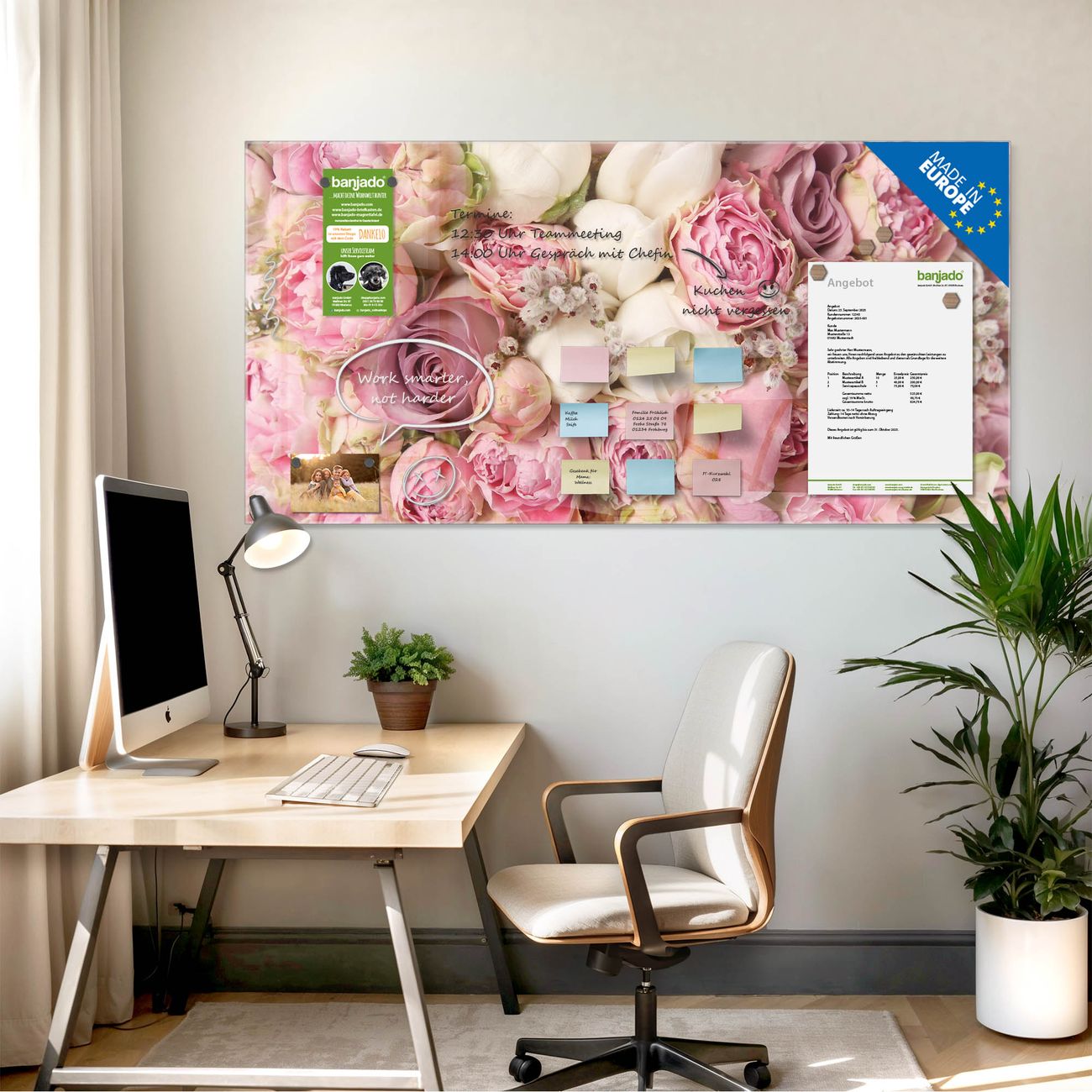 Jede Glas Magnettafel wird in unserer Werkstatt von Hand gefertigt und sorgfältig geprüft. So erhalten Sie ein echtes Qualitätsprodukt, das Funktion und Ästhetik perfekt vereint.?? Warum banjado?