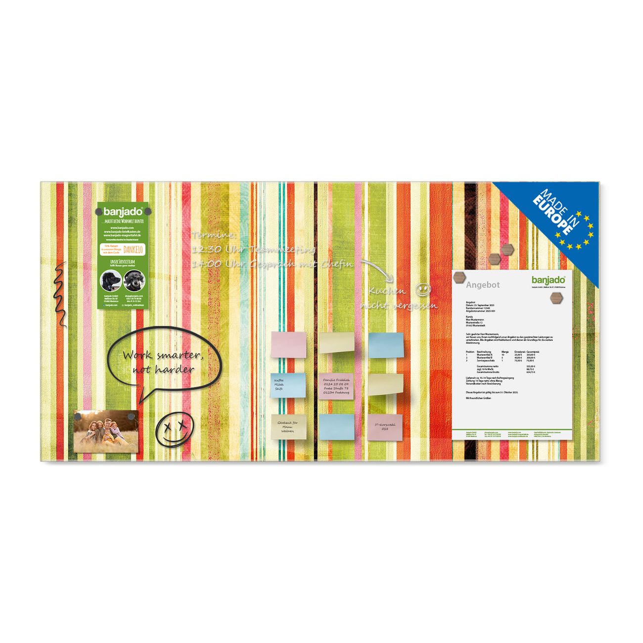 Ein Stück Design, das Ihren Alltag organisiert. Schreiben, heften, inspirieren - alles an einem Ort. Qualität, die man spürt. Montage leicht gemacht. Handwerk mit Herz - veredelt in Sachsen. Einzigartiges Design mit Motiv Motiv Streifen Beschreibbare Glasoberfläche, leicht zu reinigen Starke Magnetkraft durch Stahlrückwand Inklusive 4 Neodym-Magneten Flexible Montageoptionen Handveredelt in Sachsen - Qualität, die bleibt