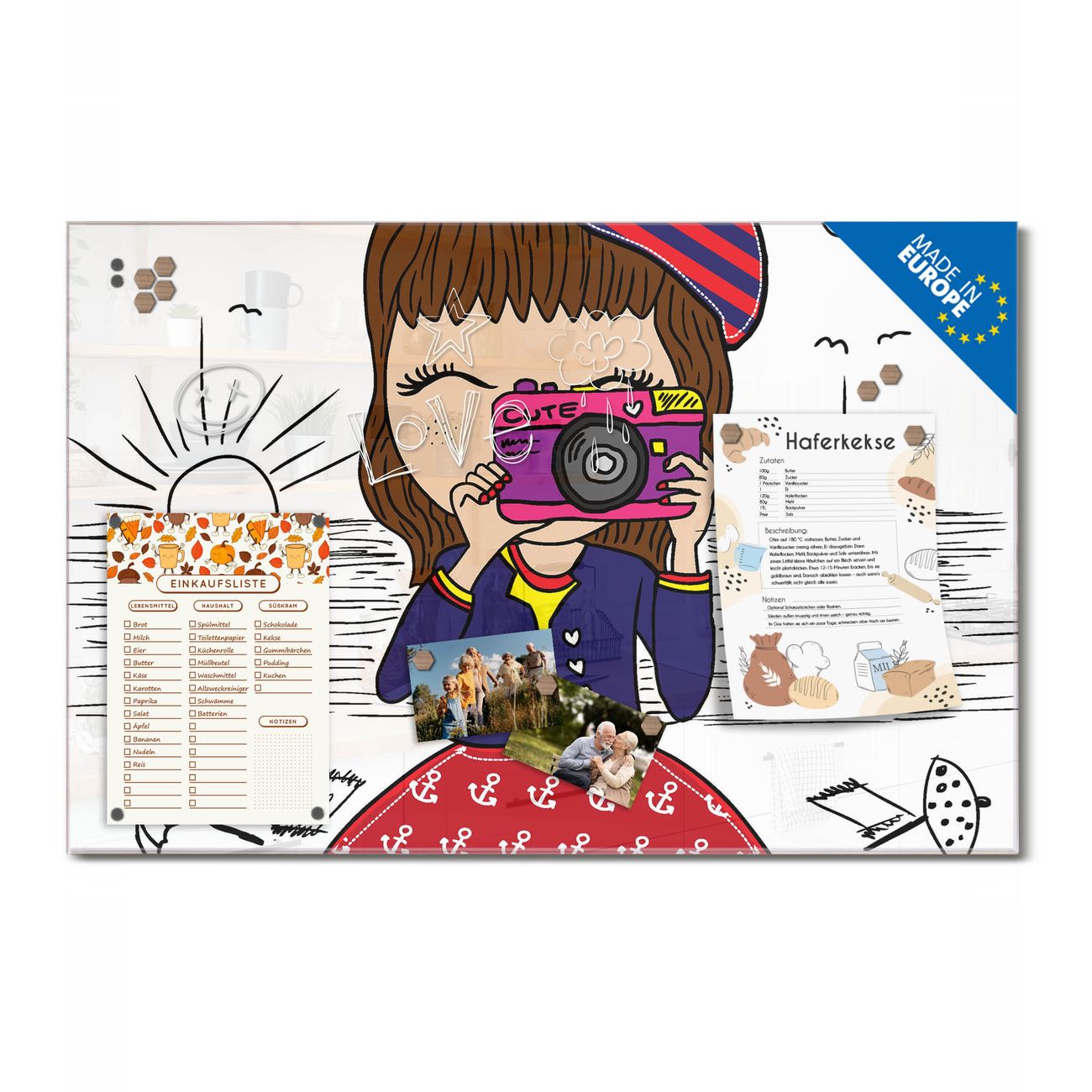 Ein Stück Design, das Ihren Alltag organisiert. Schreiben, heften, inspirieren - alles an einem Ort. Qualität, die man spürt. Montage leicht gemacht. Handwerk mit Herz - veredelt in Sachsen. Einzigartiges Design mit Motiv Motiv Süße Kamera Beschreibbare Glasoberfläche, leicht zu reinigen Starke Magnetkraft durch Stahlrückwand Inklusive 4 Neodym-Magneten Flexible Montageoptionen Handveredelt in Sachsen - Qualität, die bleibt
