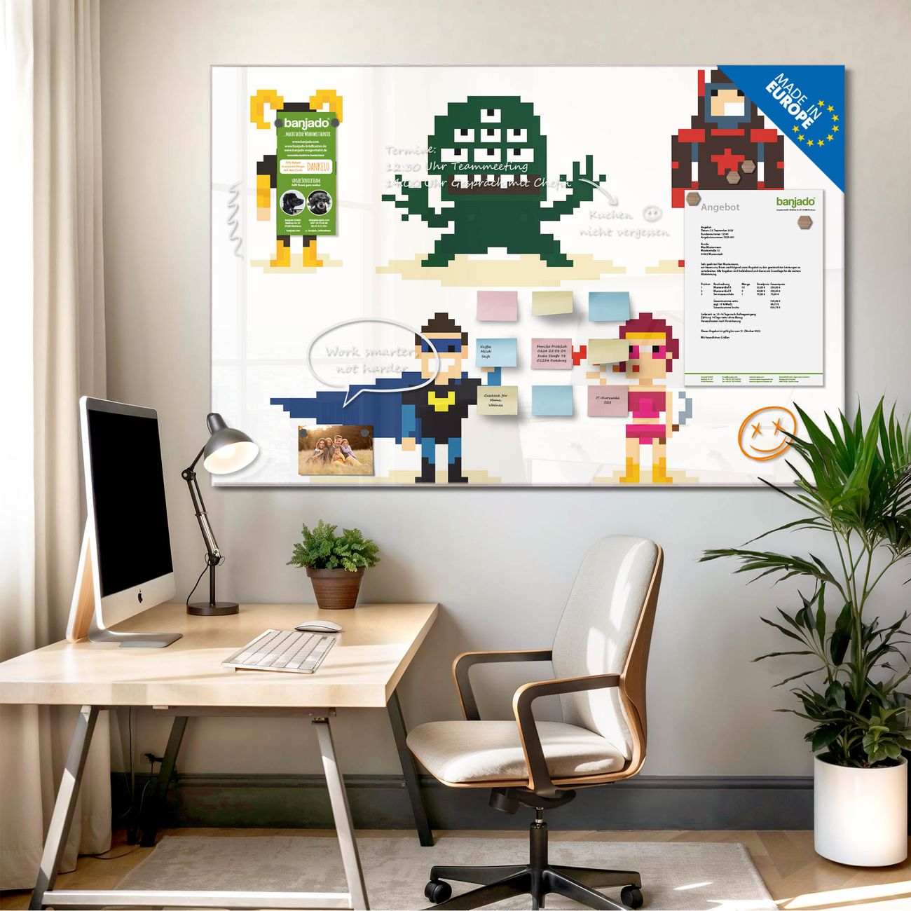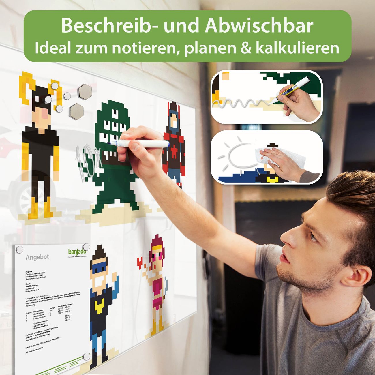 Jede Glas Magnettafel wird in unserer Werkstatt von Hand gefertigt und sorgfältig geprüft. So erhalten Sie ein echtes Qualitätsprodukt, das Funktion und Ästhetik perfekt vereint.?? Warum banjado?