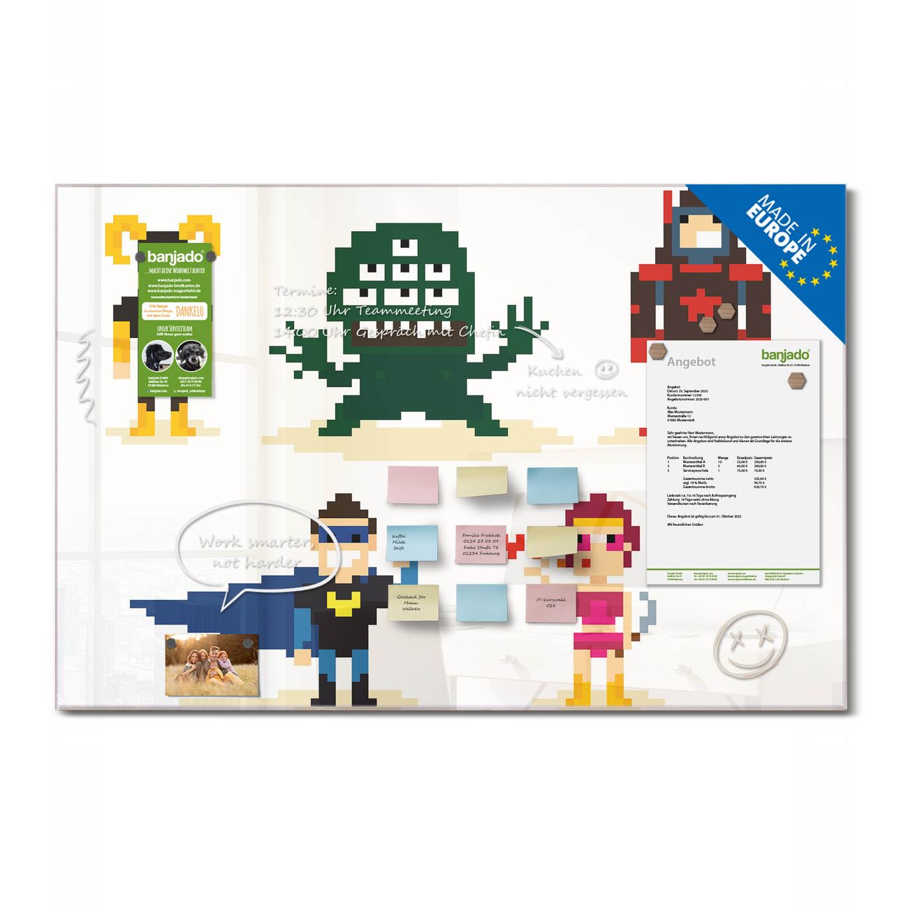 Jede Glas Magnettafel wird in unserer Werkstatt von Hand gefertigt und sorgfältig geprüft. So erhalten Sie ein echtes Qualitätsprodukt, das Funktion und Ästhetik perfekt vereint.?? Warum banjado?