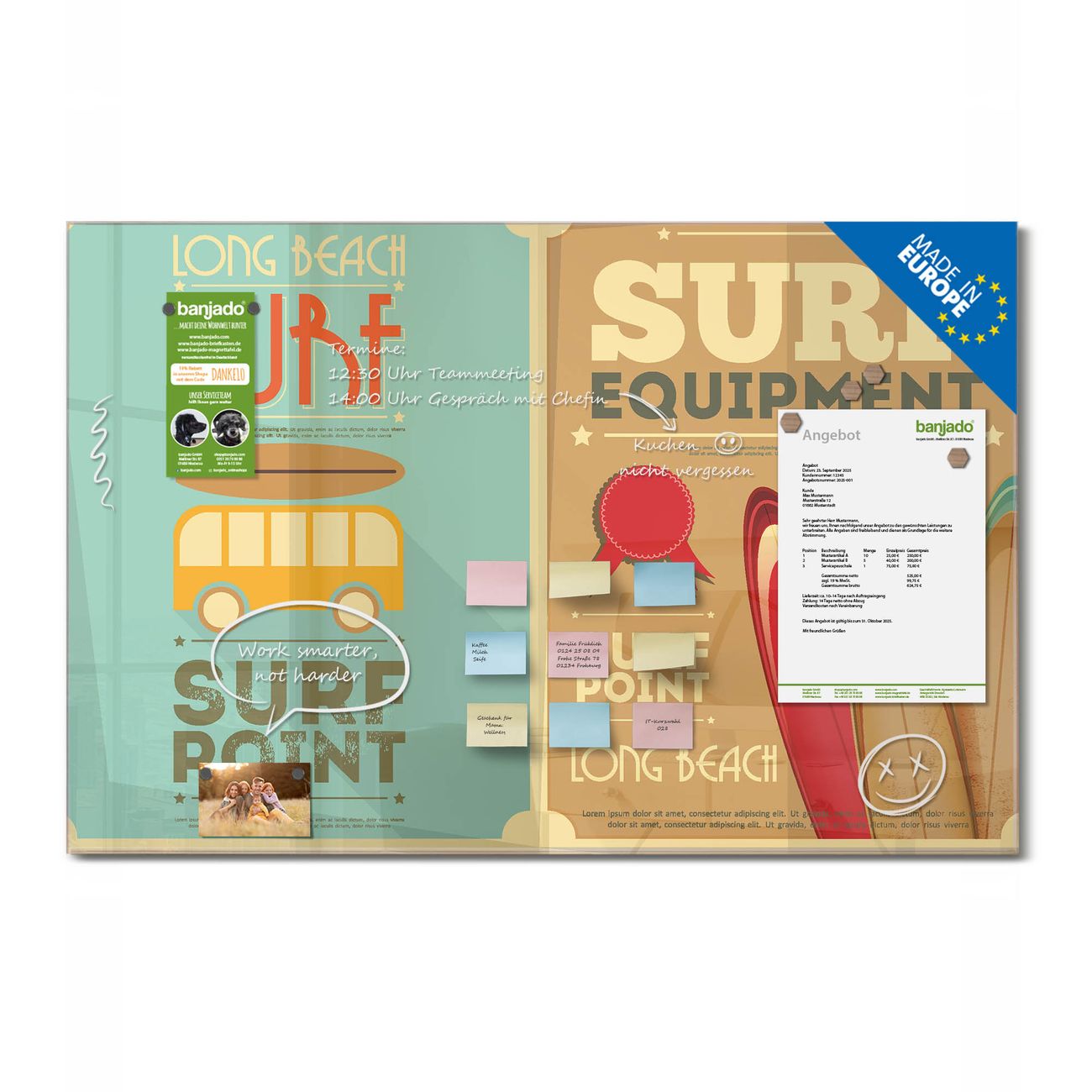 Jede Glas Magnettafel wird in unserer Werkstatt von Hand gefertigt und sorgfältig geprüft. So erhalten Sie ein echtes Qualitätsprodukt, das Funktion und Ästhetik perfekt vereint.?? Warum banjado?