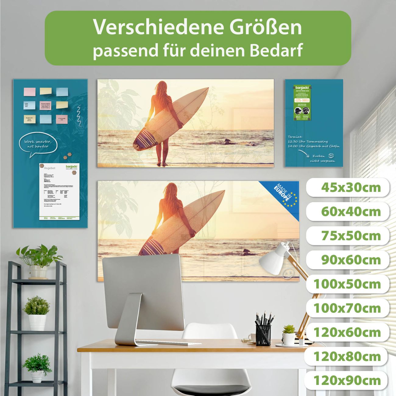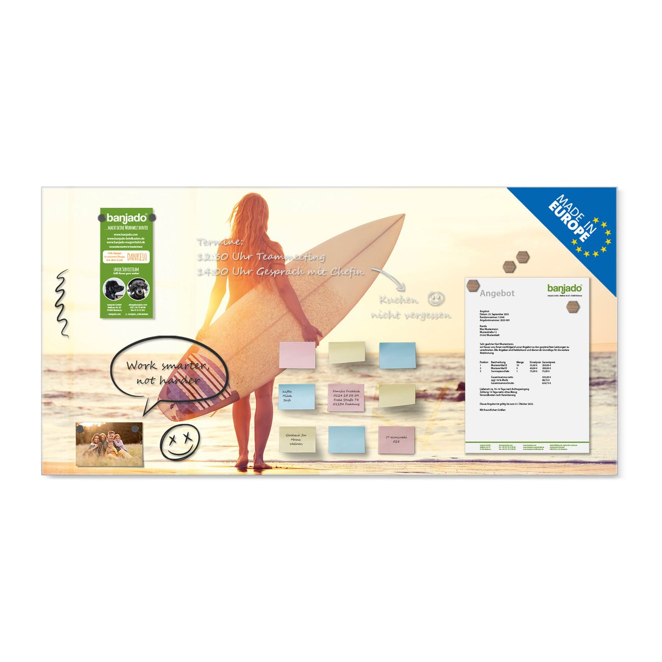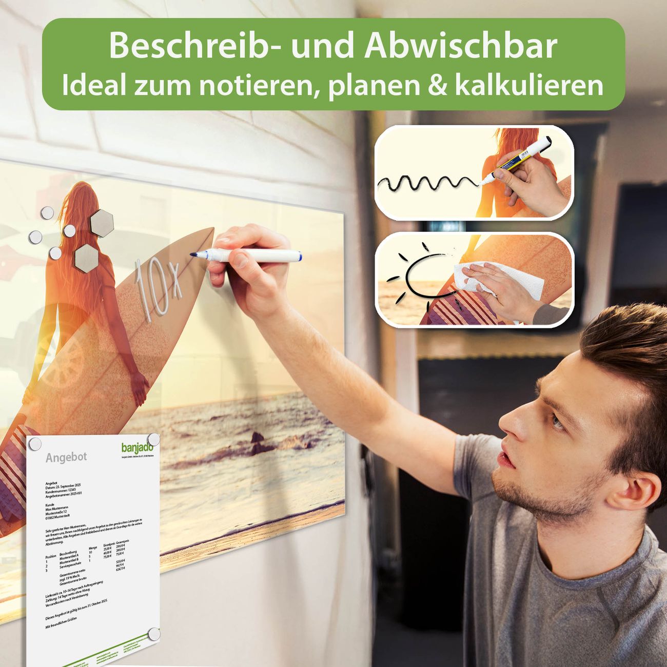 Jede Glas Magnettafel wird in unserer Werkstatt von Hand gefertigt und sorgfältig geprüft. So erhalten Sie ein echtes Qualitätsprodukt, das Funktion und Ästhetik perfekt vereint.?? Warum banjado?