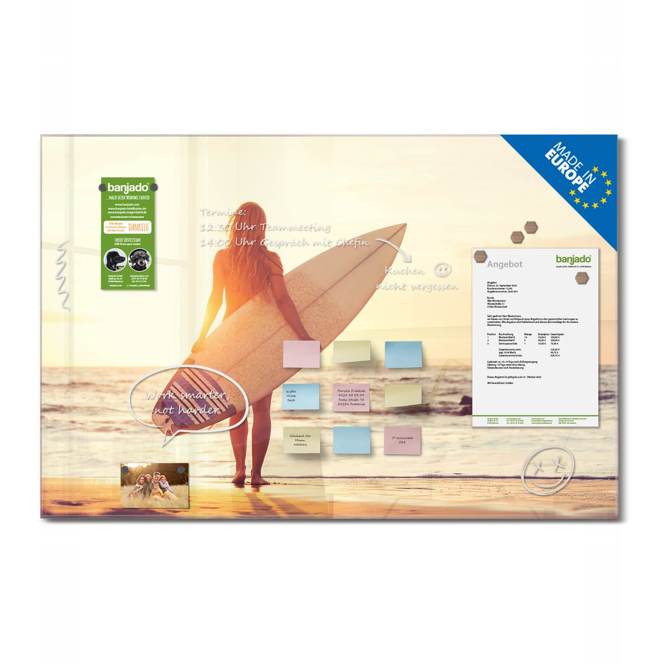 Jede Glas Magnettafel wird in unserer Werkstatt von Hand gefertigt und sorgfältig geprüft. So erhalten Sie ein echtes Qualitätsprodukt, das Funktion und Ästhetik perfekt vereint.?? Warum banjado?