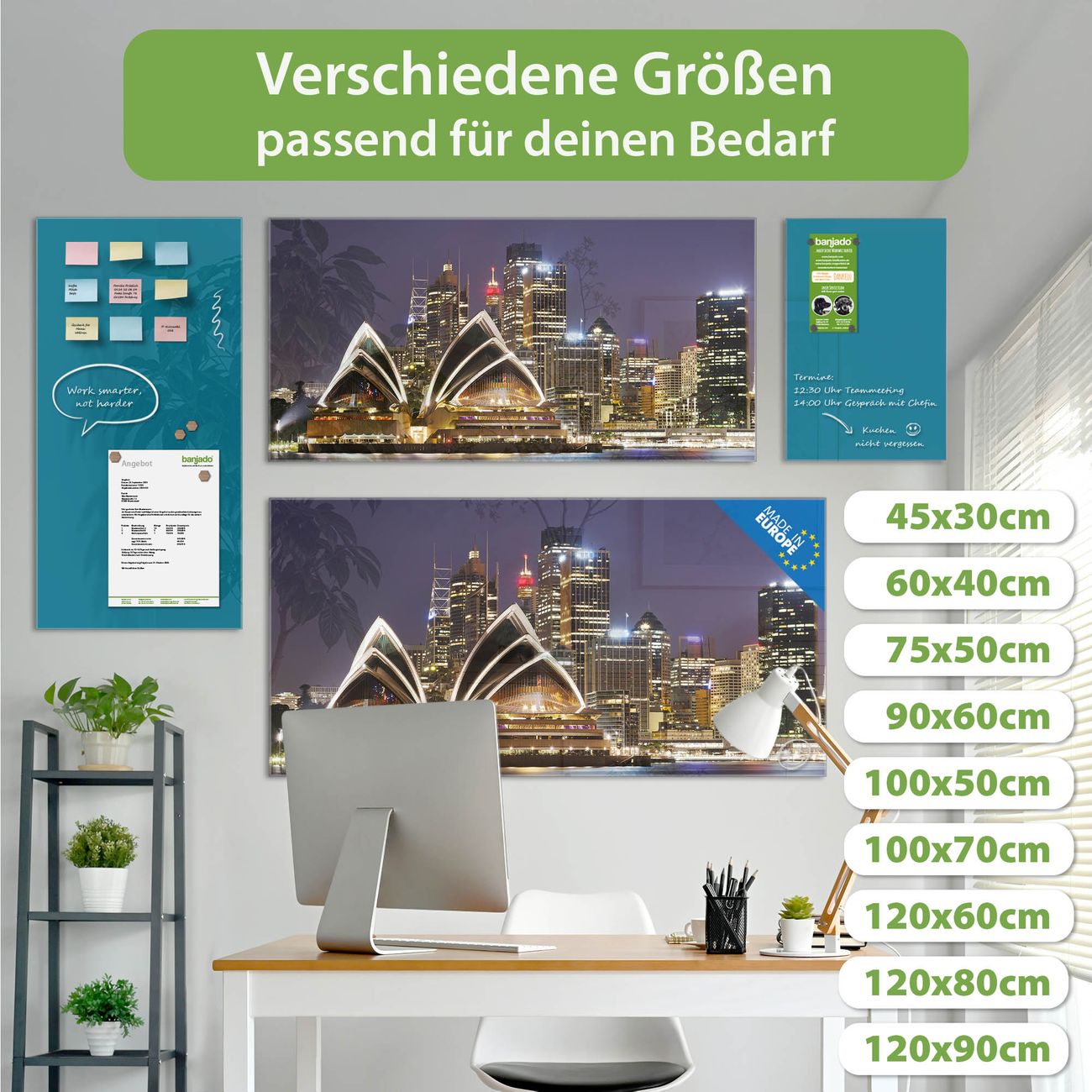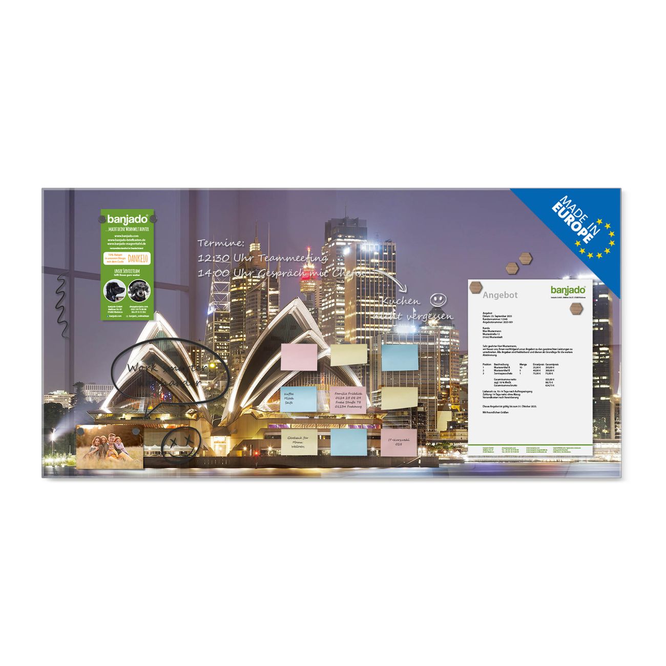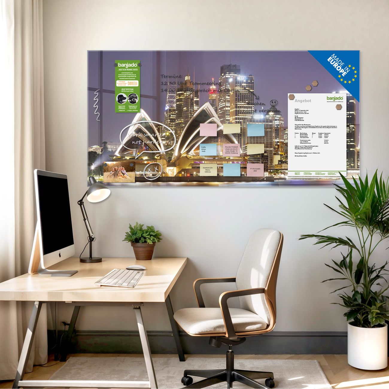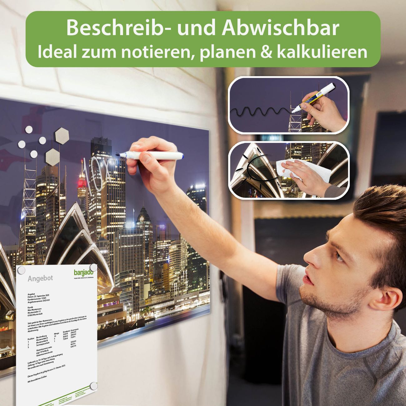 Jede Glas Magnettafel wird in unserer Werkstatt von Hand gefertigt und sorgfältig geprüft. So erhalten Sie ein echtes Qualitätsprodukt, das Funktion und Ästhetik perfekt vereint.?? Warum banjado?