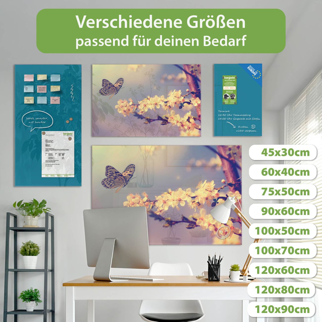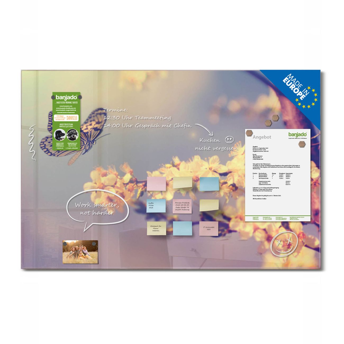 Jede Glas Magnettafel wird in unserer Werkstatt von Hand gefertigt und sorgfältig geprüft. So erhalten Sie ein echtes Qualitätsprodukt, das Funktion und Ästhetik perfekt vereint.?? Warum banjado?