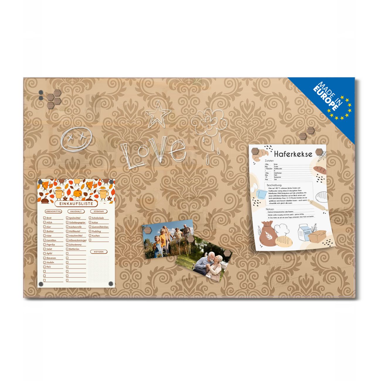 Ein Stück Design, das Ihren Alltag organisiert. Schreiben, heften, inspirieren - alles an einem Ort. Qualität, die man spürt. Montage leicht gemacht. Handwerk mit Herz - veredelt in Sachsen. Einzigartiges Design mit Motiv Motiv Tapete Beige Beschreibbare Glasoberfläche, leicht zu reinigen Starke Magnetkraft durch Stahlrückwand Inklusive 4 Neodym-Magneten Flexible Montageoptionen Handveredelt in Sachsen - Qualität, die bleibt