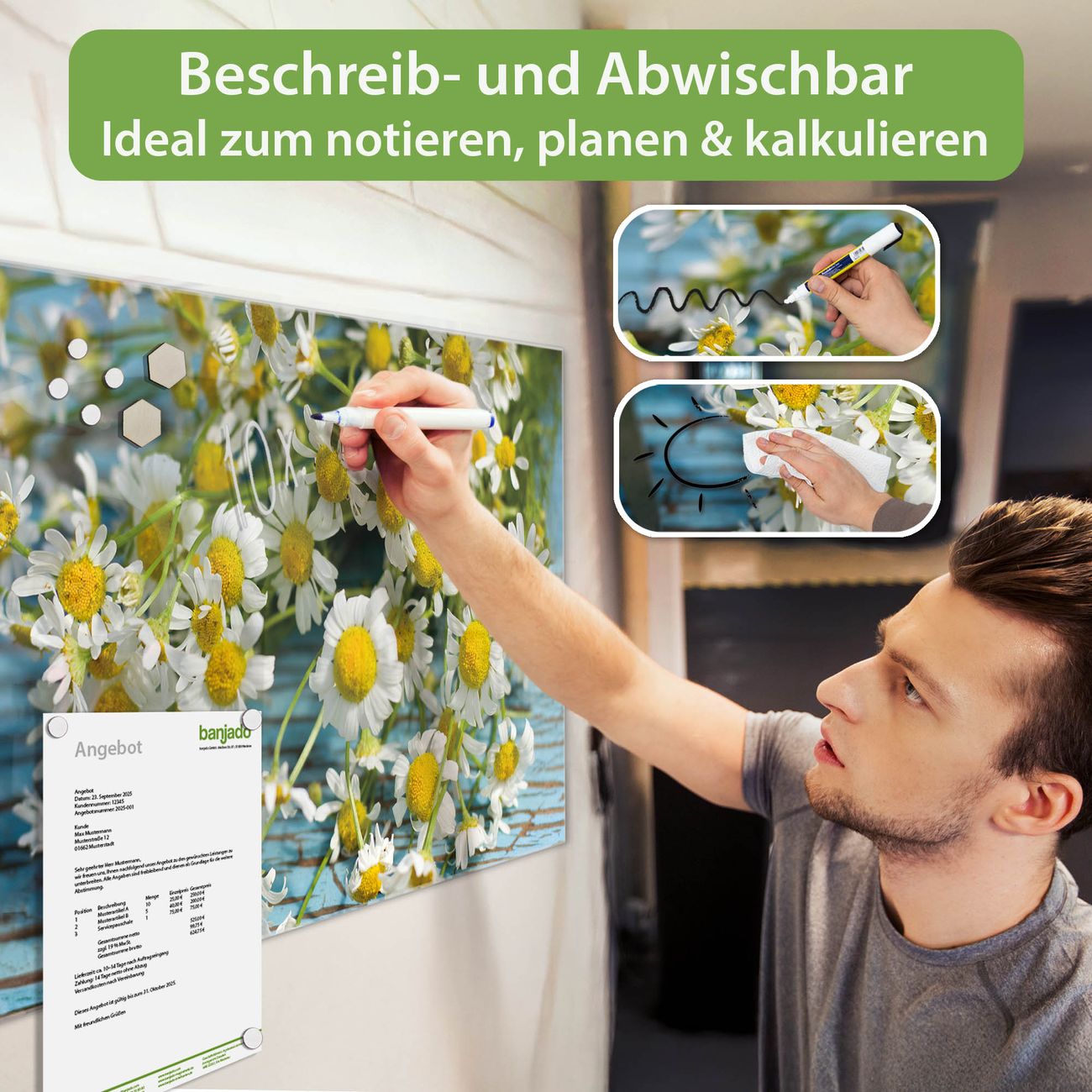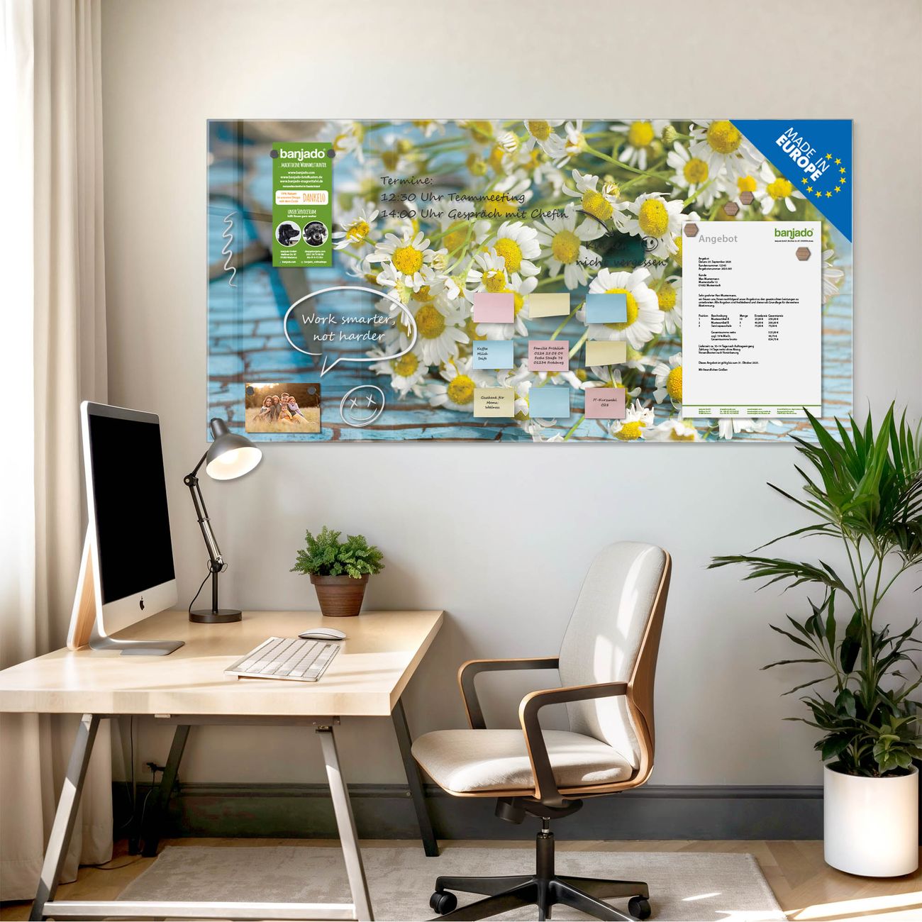 Jede Glas Magnettafel wird in unserer Werkstatt von Hand gefertigt und sorgfältig geprüft. So erhalten Sie ein echtes Qualitätsprodukt, das Funktion und Ästhetik perfekt vereint.?? Warum banjado?