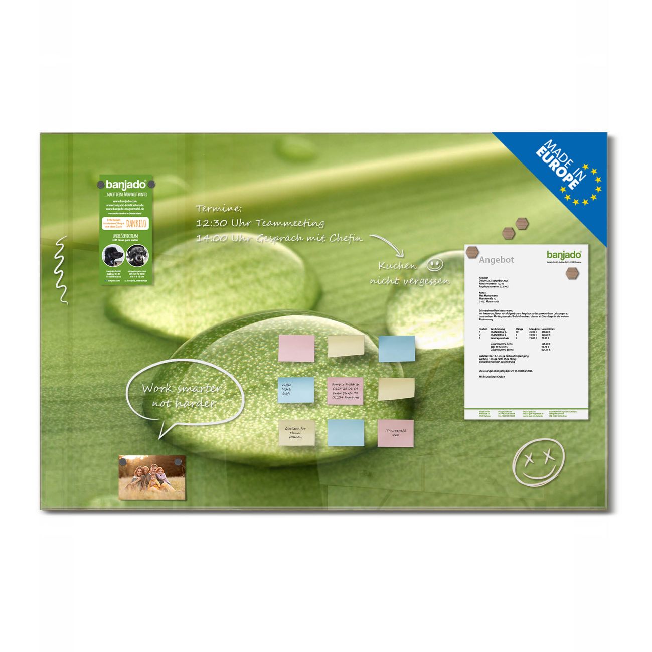 Jede Glas Magnettafel wird in unserer Werkstatt von Hand gefertigt und sorgfältig geprüft. So erhalten Sie ein echtes Qualitätsprodukt, das Funktion und Ästhetik perfekt vereint.?? Warum banjado?