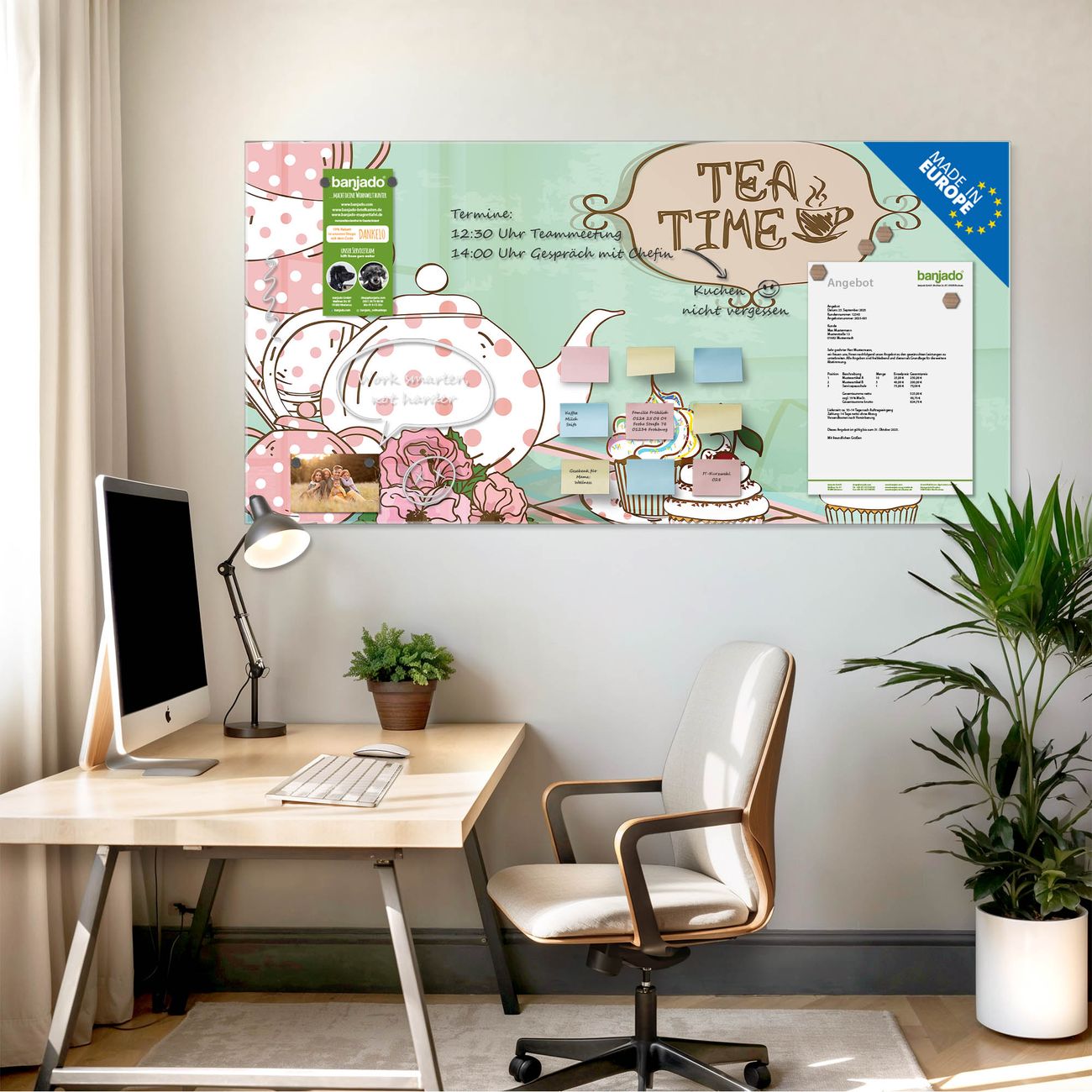 Die banjado Glas Magnettafel mit dem Motiv Motiv Tea Time verbindet Funktionalität mit Stil. Sie ersetzt das Zettelchaos durch klare Strukturen und bringt dabei eine warme, natürliche Atmosphäre in Ihr Zuhause. Ob im Büro, in der Küche oder im Eingangsbereich - dieses Design-Board zieht Blicke an und sorgt für Ordnung mit Charakter.