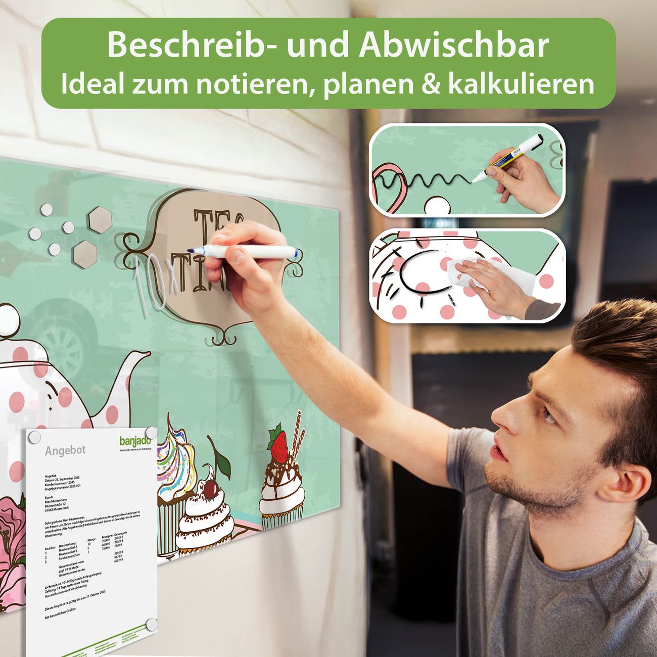 Jede Glas Magnettafel wird in unserer Werkstatt von Hand gefertigt und sorgfältig geprüft. So erhalten Sie ein echtes Qualitätsprodukt, das Funktion und Ästhetik perfekt vereint.?? Warum banjado?