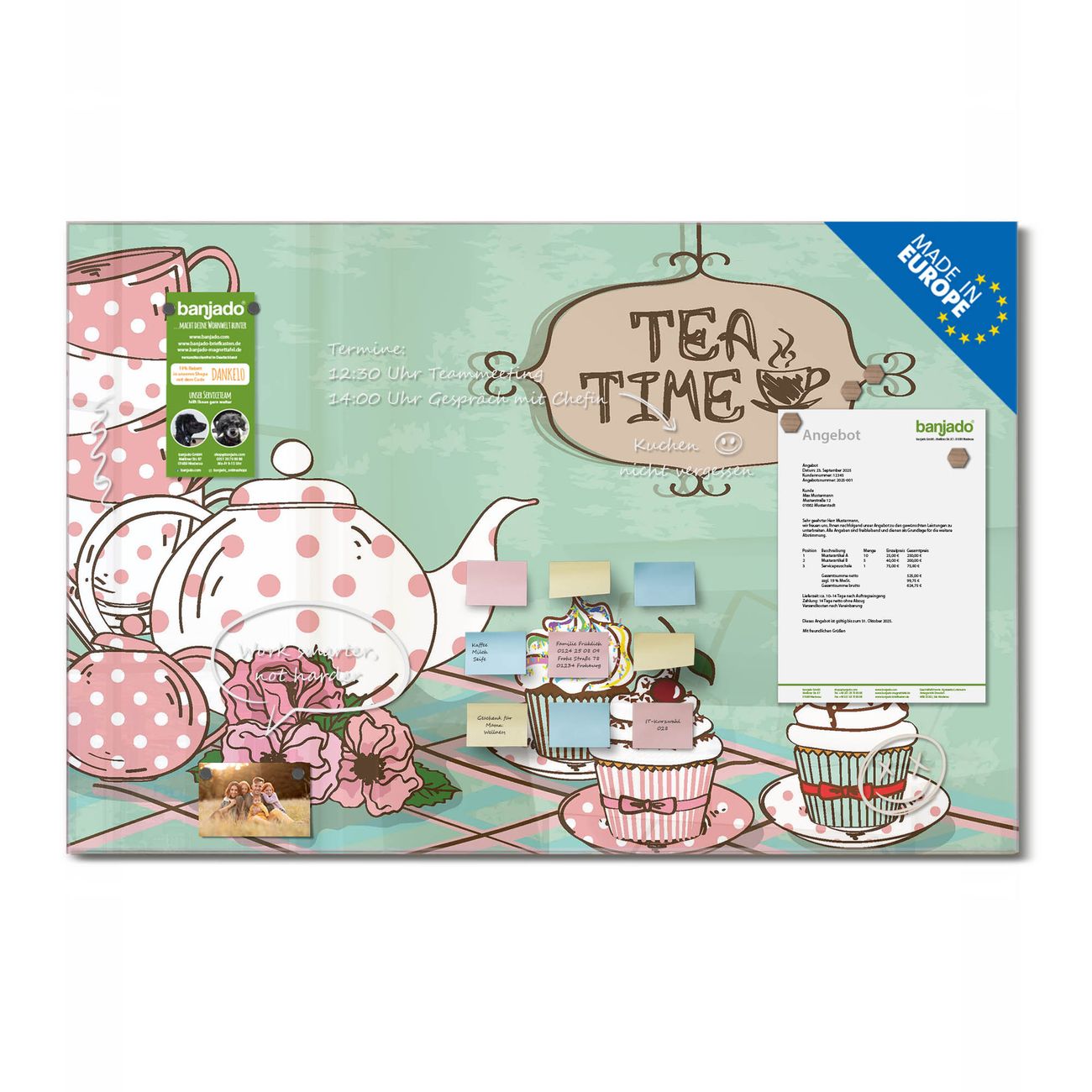 Ein Stück Design, das Ihren Alltag organisiert. Schreiben, heften, inspirieren - alles an einem Ort. Qualität, die man spürt. Montage leicht gemacht. Handwerk mit Herz - veredelt in Sachsen. Einzigartiges Design mit Motiv Motiv Tea Time Beschreibbare Glasoberfläche, leicht zu reinigen Starke Magnetkraft durch Stahlrückwand Inklusive 4 Neodym-Magneten Flexible Montageoptionen Handveredelt in Sachsen - Qualität, die bleibt