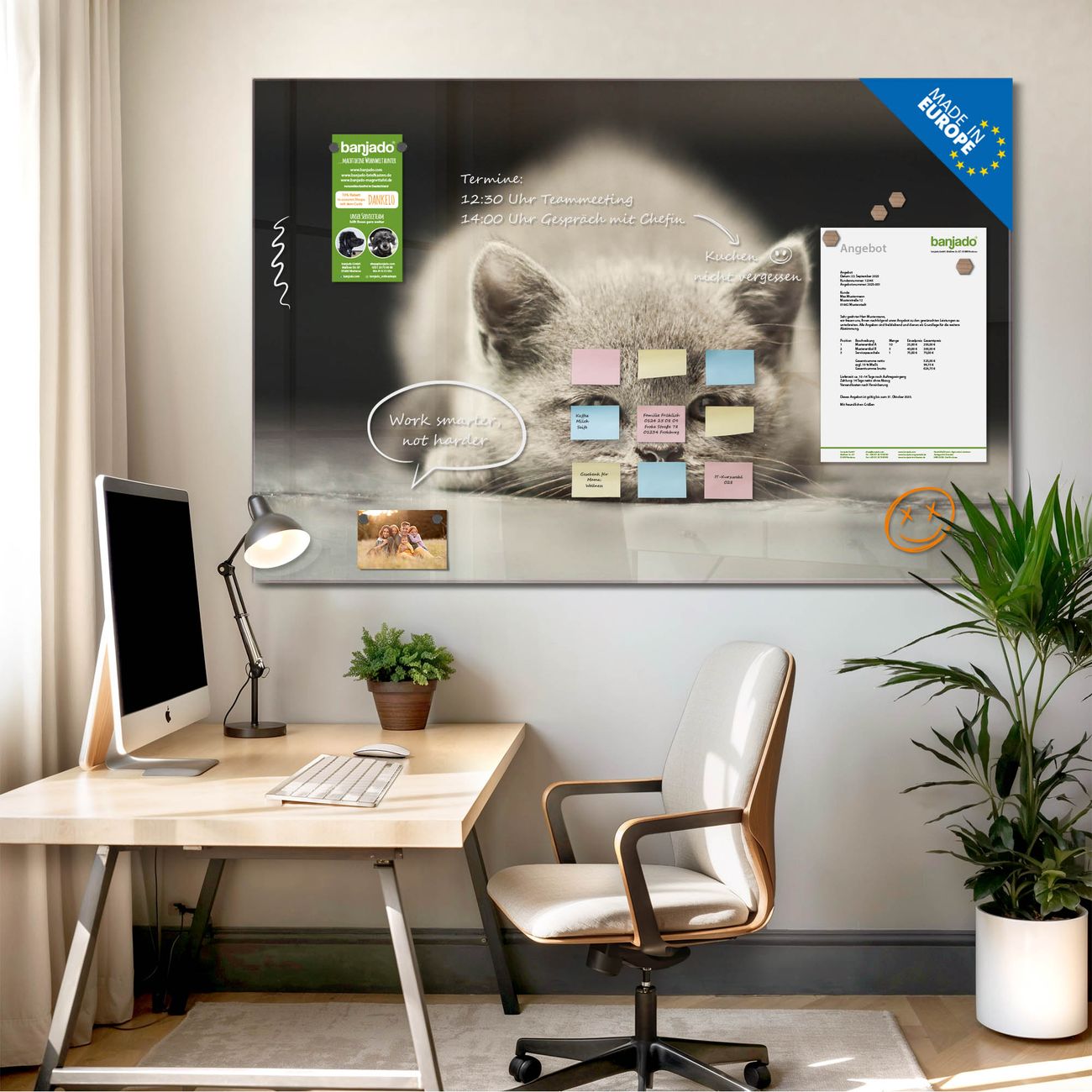 Jede Glas Magnettafel wird in unserer Werkstatt von Hand gefertigt und sorgfältig geprüft. So erhalten Sie ein echtes Qualitätsprodukt, das Funktion und Ästhetik perfekt vereint.?? Warum banjado?