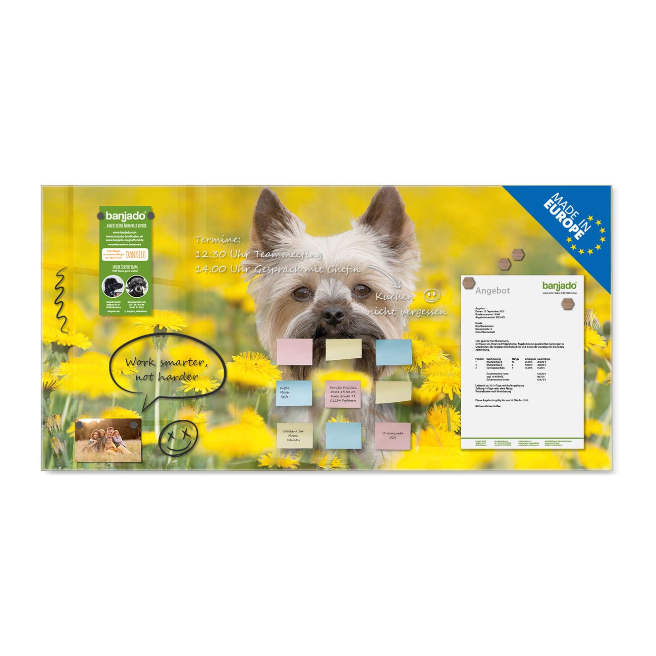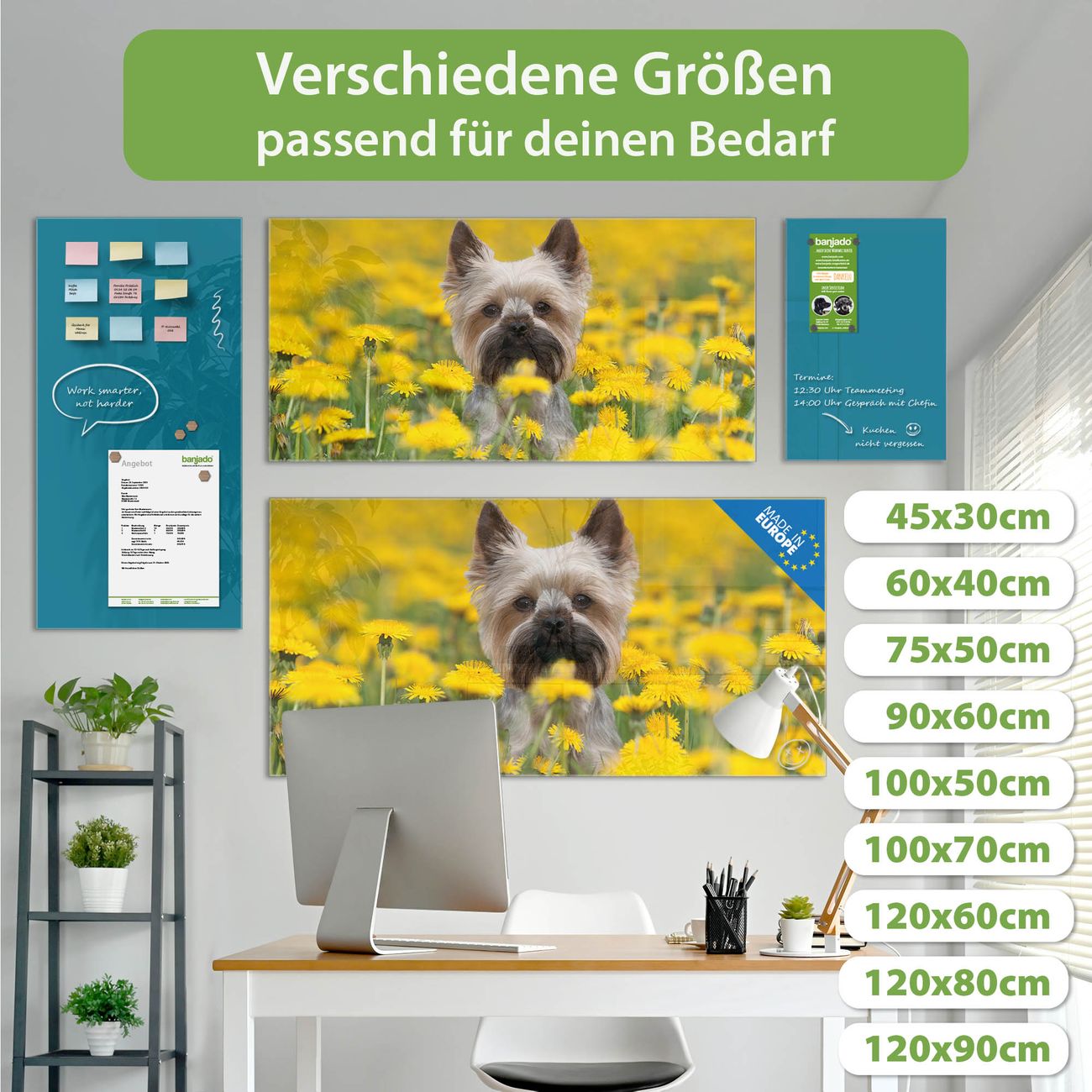 Jede Glas Magnettafel wird in unserer Werkstatt von Hand gefertigt und sorgfältig geprüft. So erhalten Sie ein echtes Qualitätsprodukt, das Funktion und Ästhetik perfekt vereint.?? Warum banjado?
