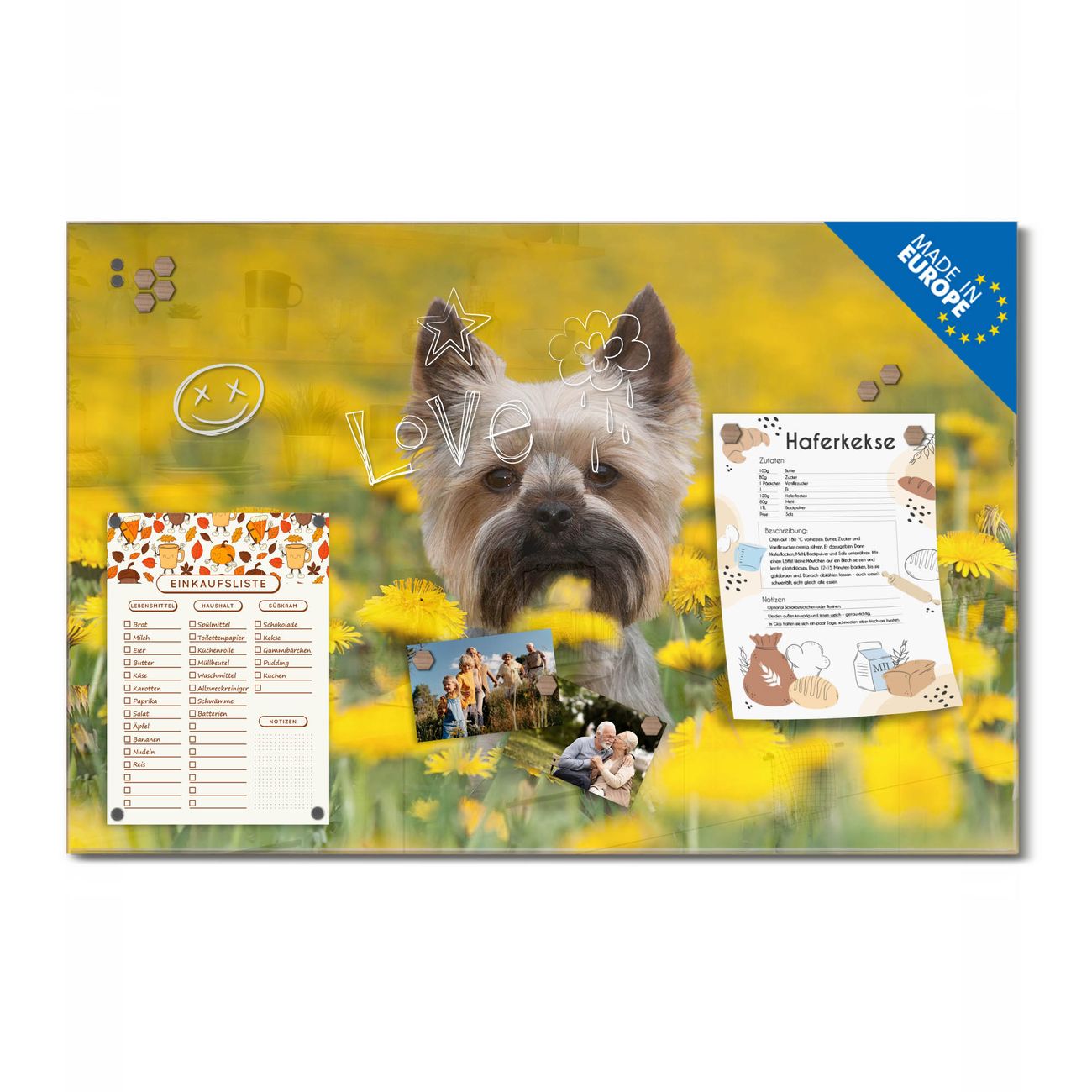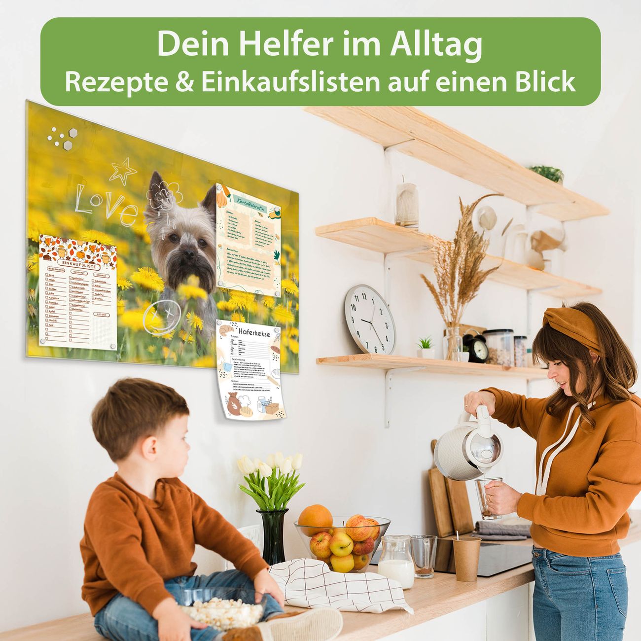 Auf der glatten Glasoberfläche lassen sich Termine, Rezepte oder Notizen ganz einfach mit Kreidestiften festhalten und rückstandslos entfernen. Starke Neodym-Magnete halten Ihre wichtigsten Erinnerungen sicher an Ort und Stelle. So entsteht Ihre ganz persönliche Ideenwand - jeden Tag neu.