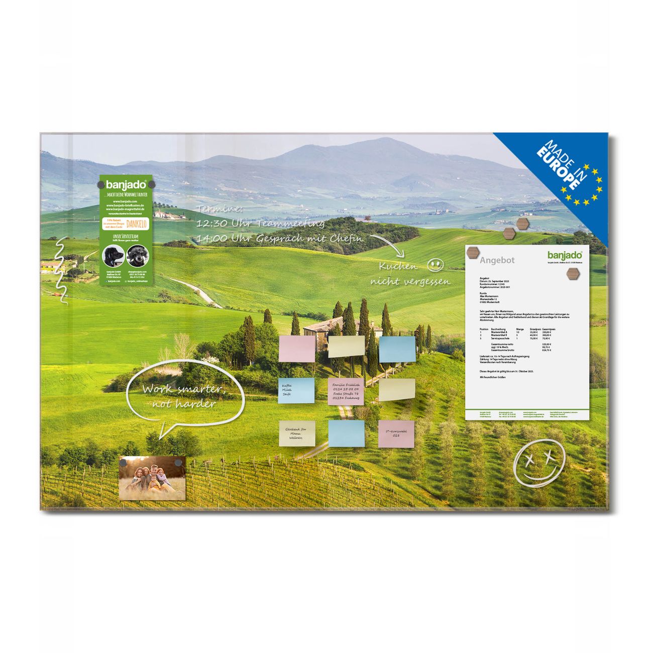 Jede Glas Magnettafel wird in unserer Werkstatt von Hand gefertigt und sorgfältig geprüft. So erhalten Sie ein echtes Qualitätsprodukt, das Funktion und Ästhetik perfekt vereint.?? Warum banjado?