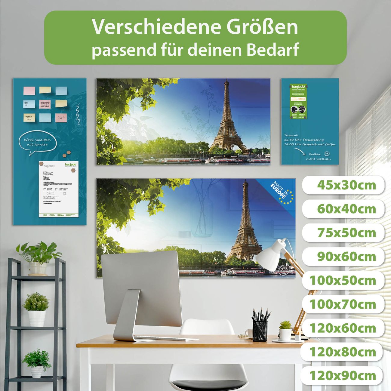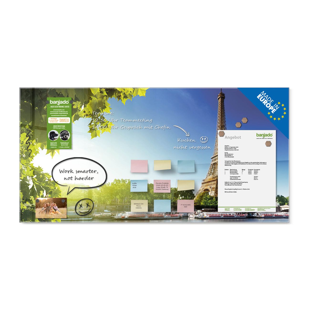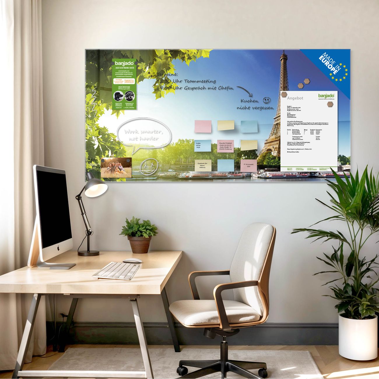 Jede Glas Magnettafel wird in unserer Werkstatt von Hand gefertigt und sorgfältig geprüft. So erhalten Sie ein echtes Qualitätsprodukt, das Funktion und Ästhetik perfekt vereint.?? Warum banjado?