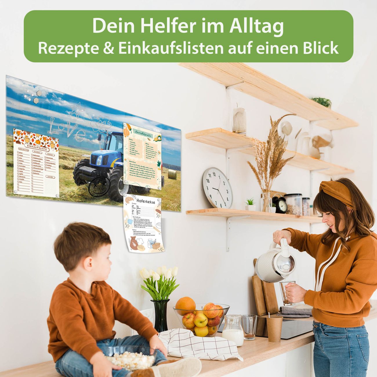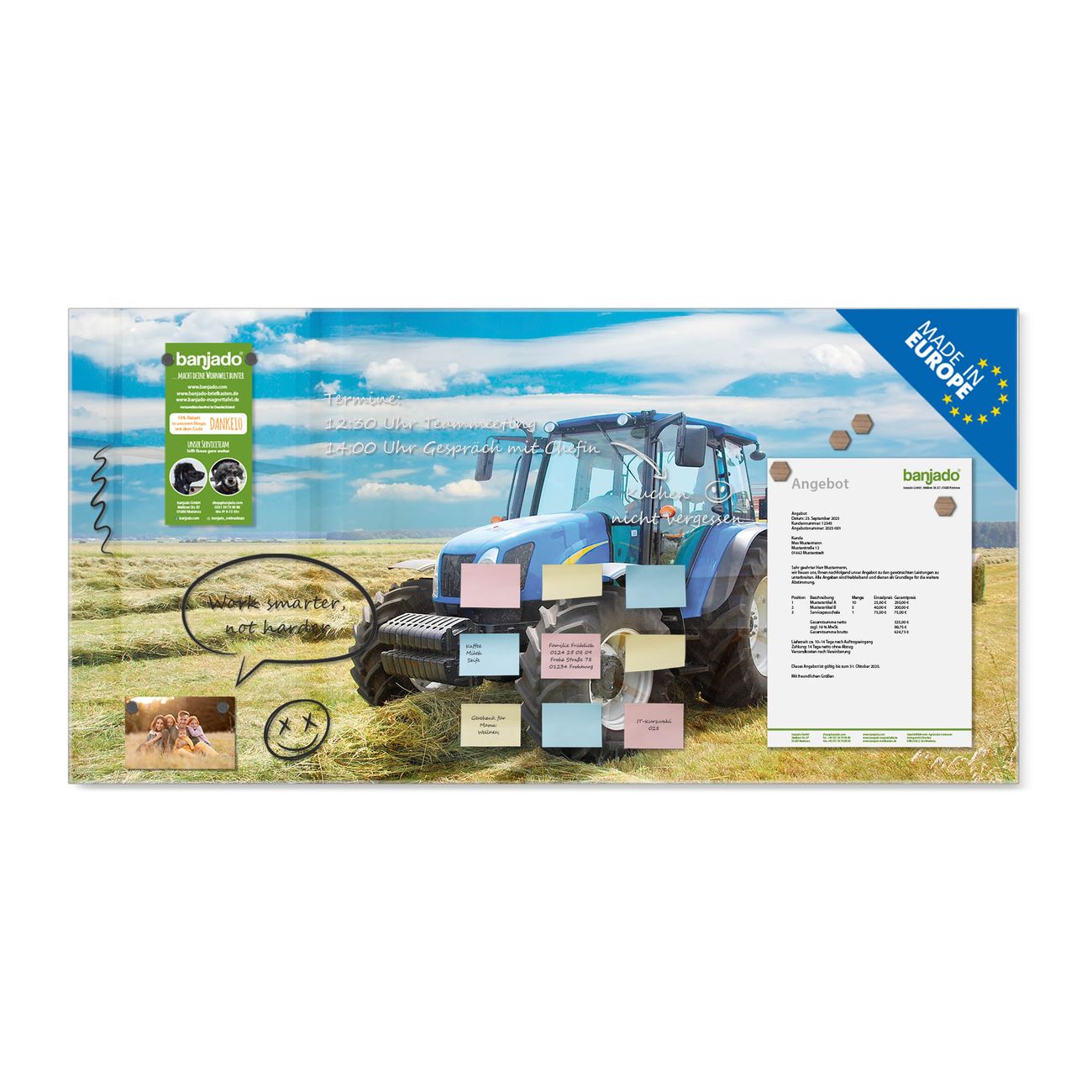 Die banjado Glas Magnettafel mit dem Motiv Motiv Traktor verbindet Funktionalität mit Stil. Sie ersetzt das Zettelchaos durch klare Strukturen und bringt dabei eine warme, natürliche Atmosphäre in Ihr Zuhause. Ob im Büro, in der Küche oder im Eingangsbereich - dieses Design-Board zieht Blicke an und sorgt für Ordnung mit Charakter.