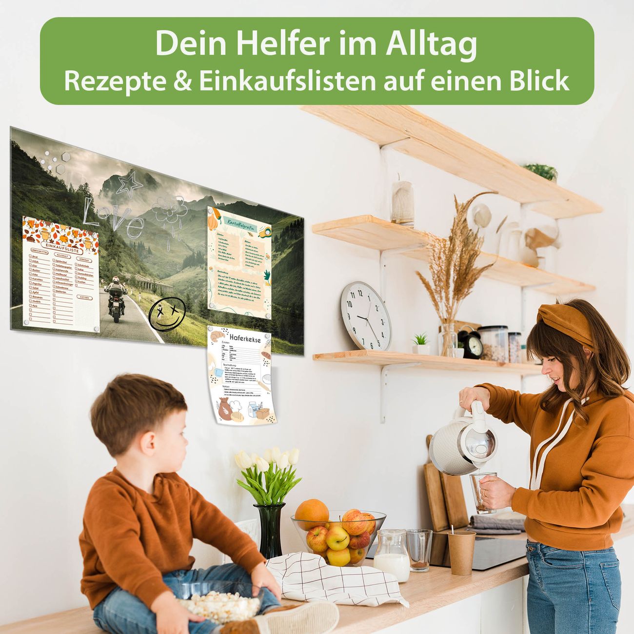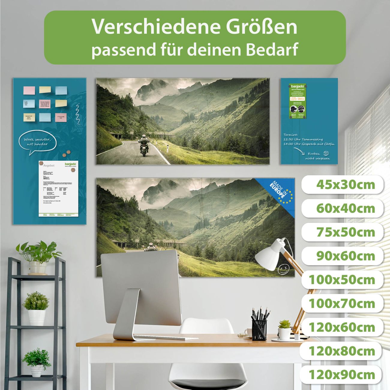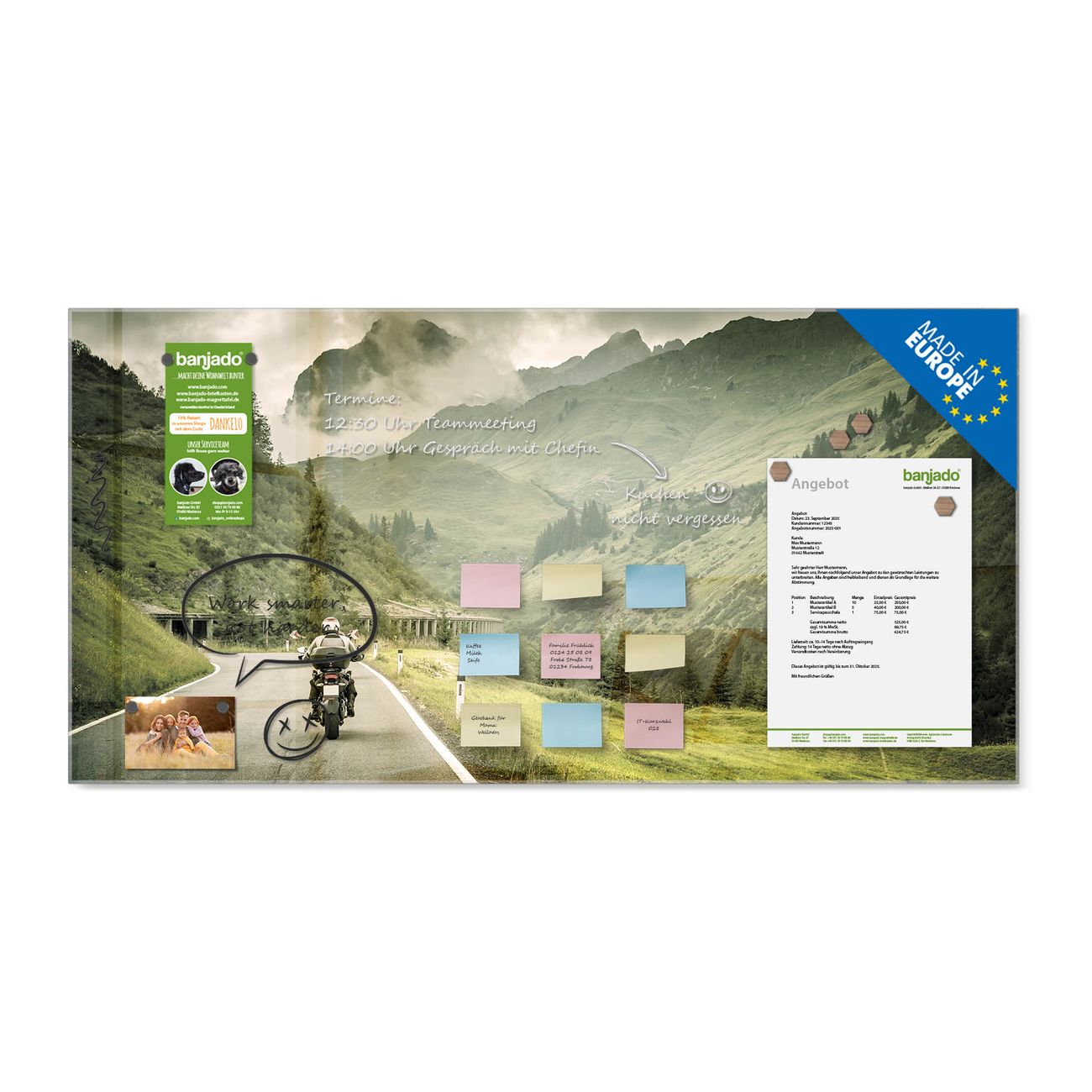 Die banjado Glas Magnettafel mit dem Motiv Motiv Transalp verbindet Funktionalität mit Stil. Sie ersetzt das Zettelchaos durch klare Strukturen und bringt dabei eine warme, natürliche Atmosphäre in Ihr Zuhause. Ob im Büro, in der Küche oder im Eingangsbereich - dieses Design-Board zieht Blicke an und sorgt für Ordnung mit Charakter.