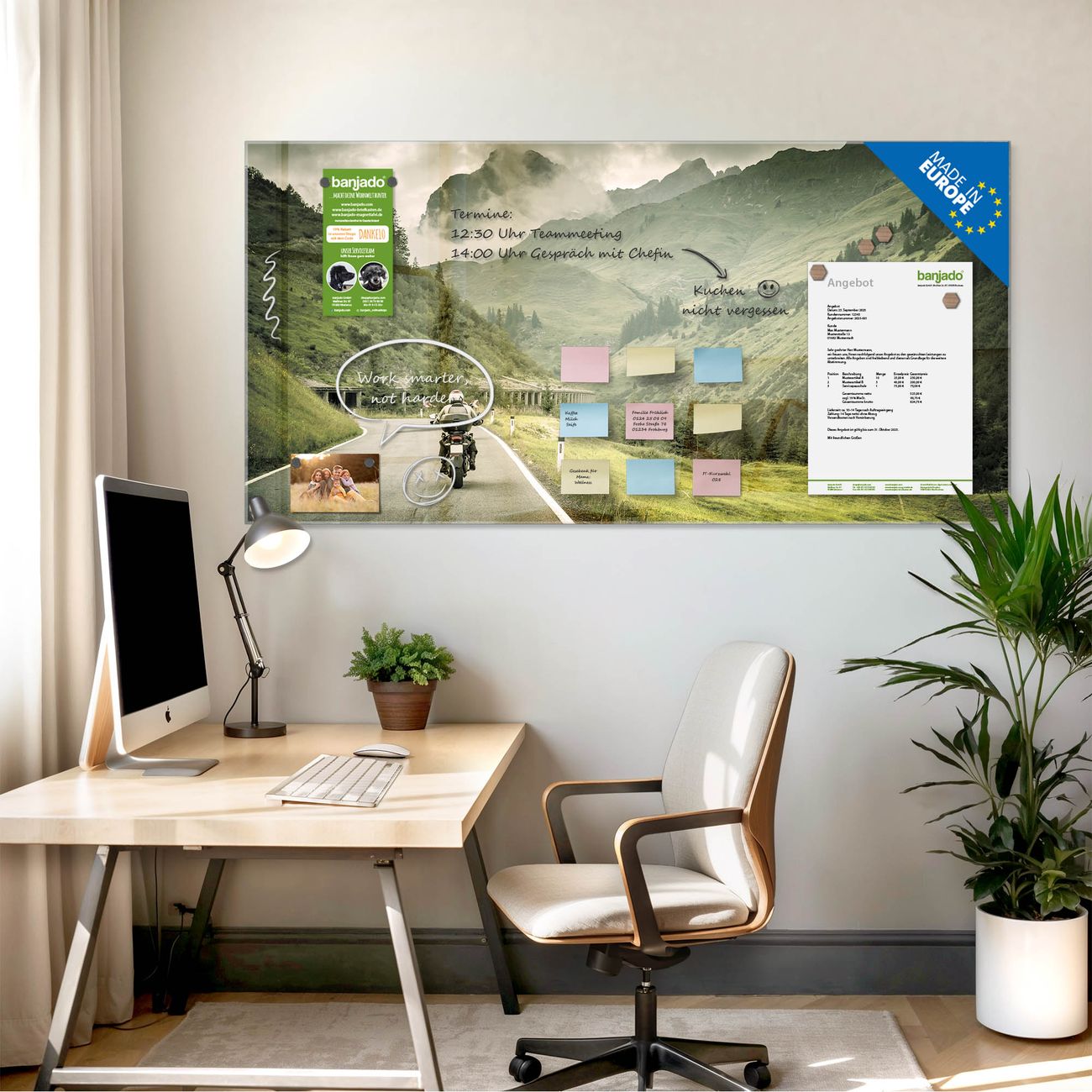 Jede Glas Magnettafel wird in unserer Werkstatt von Hand gefertigt und sorgfältig geprüft. So erhalten Sie ein echtes Qualitätsprodukt, das Funktion und Ästhetik perfekt vereint.?? Warum banjado?
