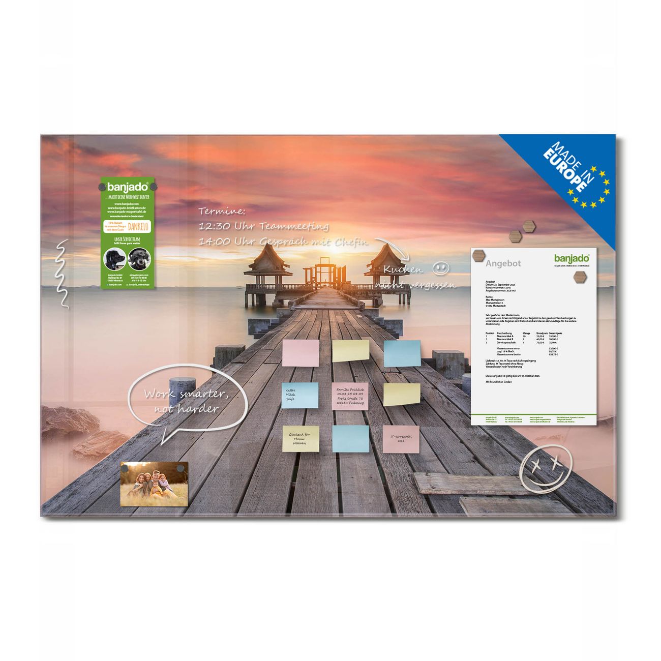 Jede Glas Magnettafel wird in unserer Werkstatt von Hand gefertigt und sorgfältig geprüft. So erhalten Sie ein echtes Qualitätsprodukt, das Funktion und Ästhetik perfekt vereint.?? Warum banjado?