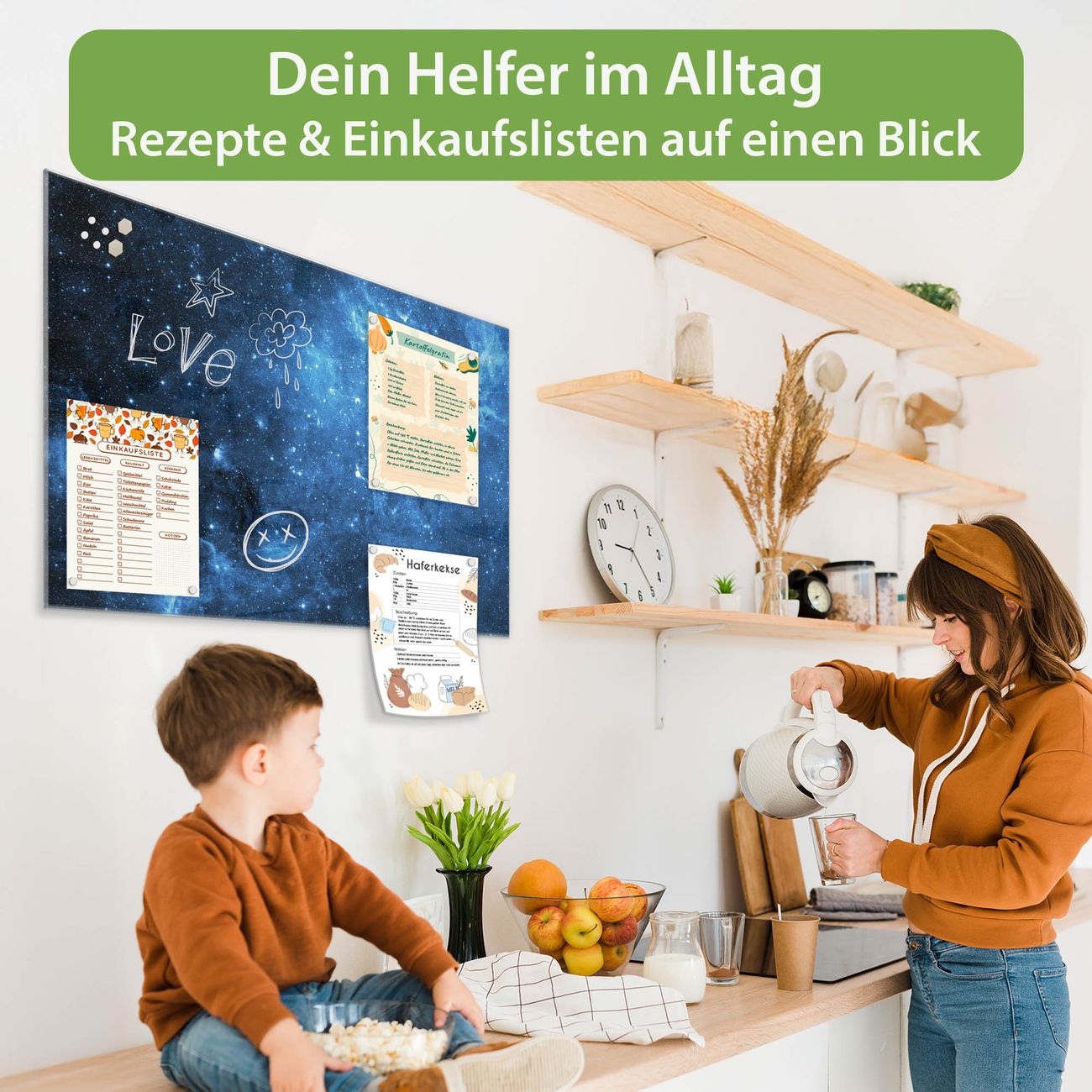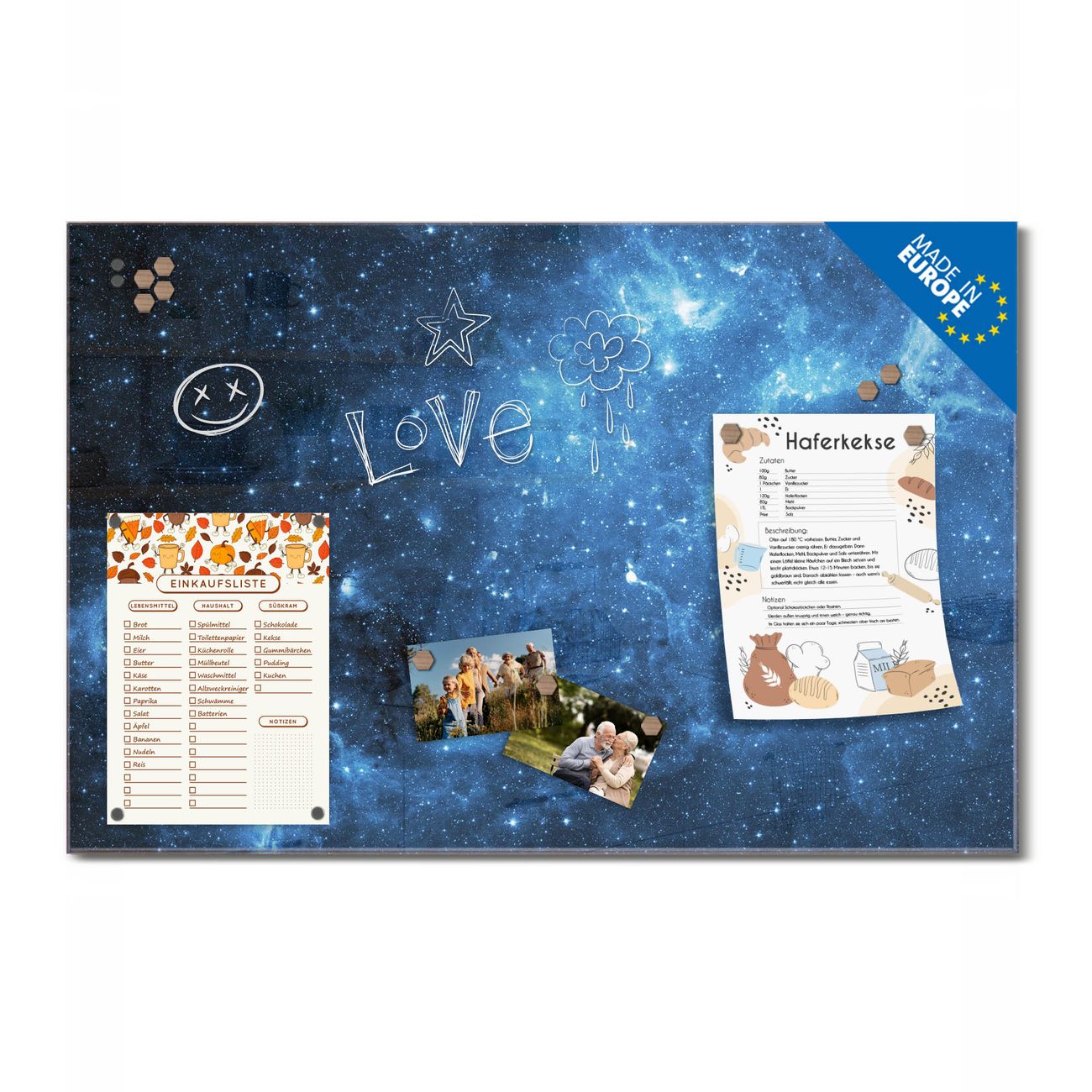 Ein Stück Design, das Ihren Alltag organisiert. Schreiben, heften, inspirieren - alles an einem Ort. Qualität, die man spürt. Montage leicht gemacht. Handwerk mit Herz - veredelt in Sachsen. Einzigartiges Design mit Motiv Motiv Universum Beschreibbare Glasoberfläche, leicht zu reinigen Starke Magnetkraft durch Stahlrückwand Inklusive 4 Neodym-Magneten Flexible Montageoptionen Handveredelt in Sachsen - Qualität, die bleibt