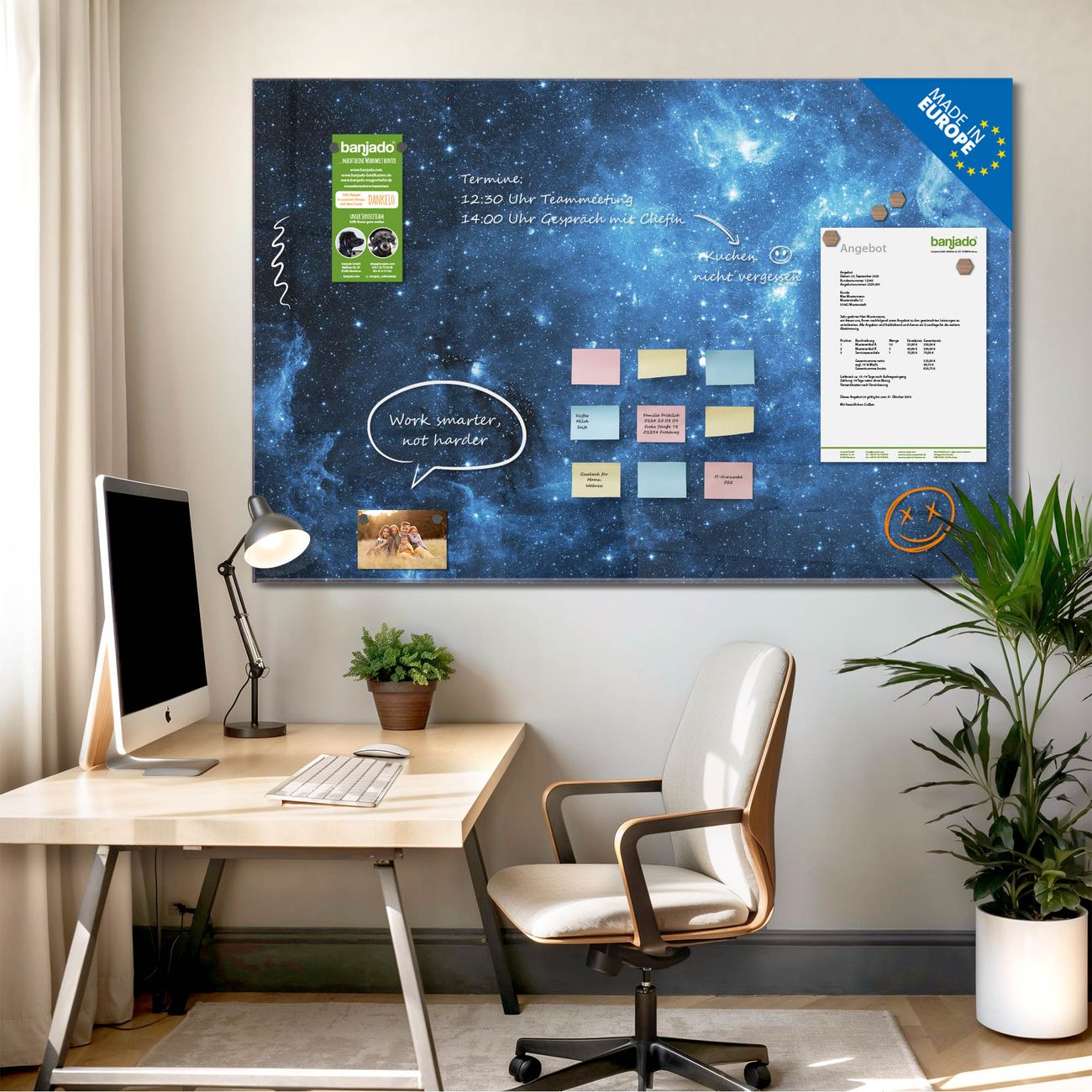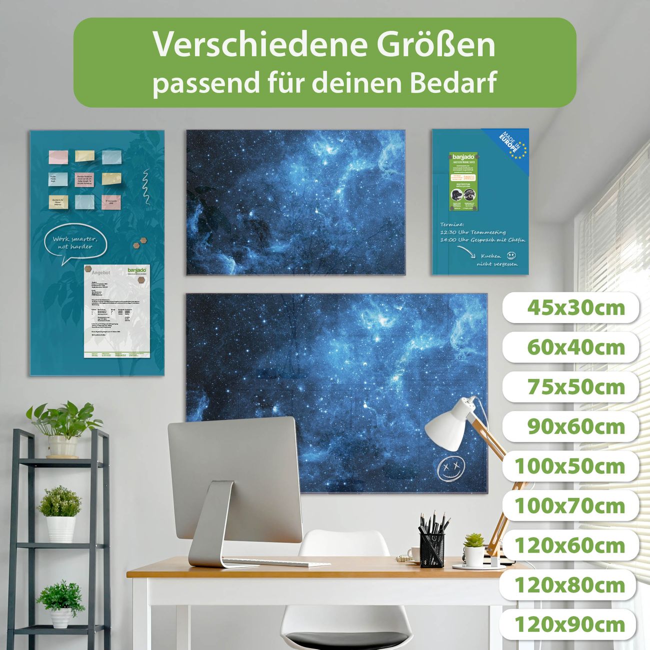 Jede Glas Magnettafel wird in unserer Werkstatt von Hand gefertigt und sorgfältig geprüft. So erhalten Sie ein echtes Qualitätsprodukt, das Funktion und Ästhetik perfekt vereint.?? Warum banjado?