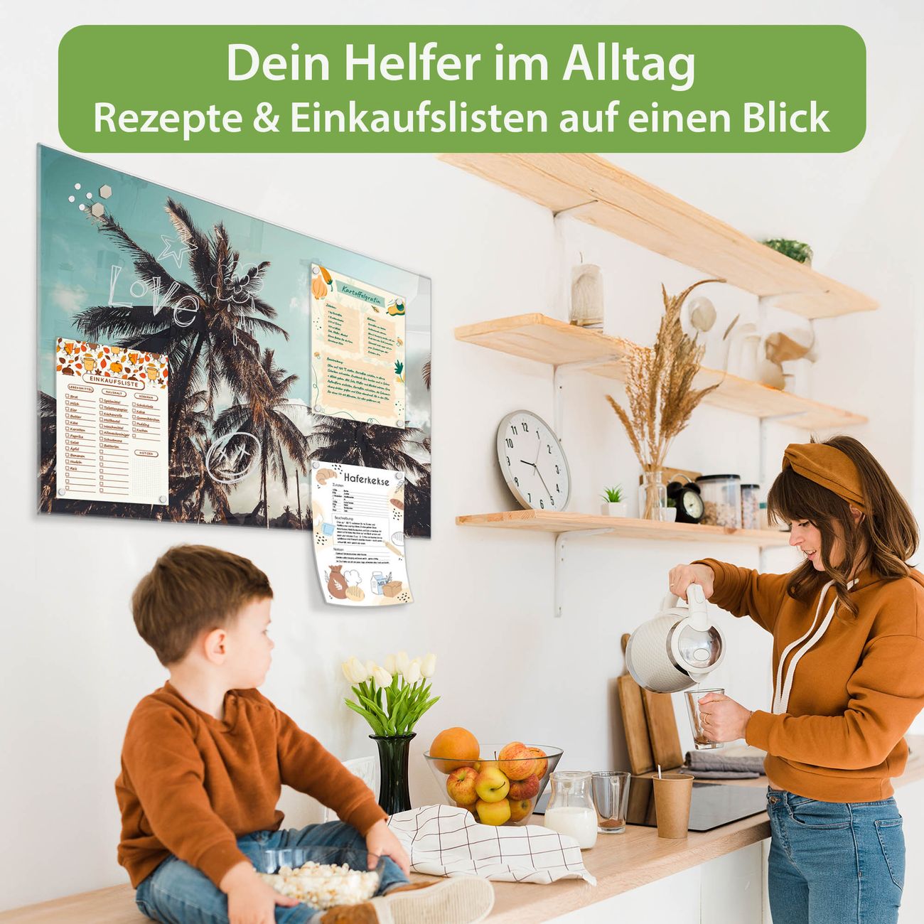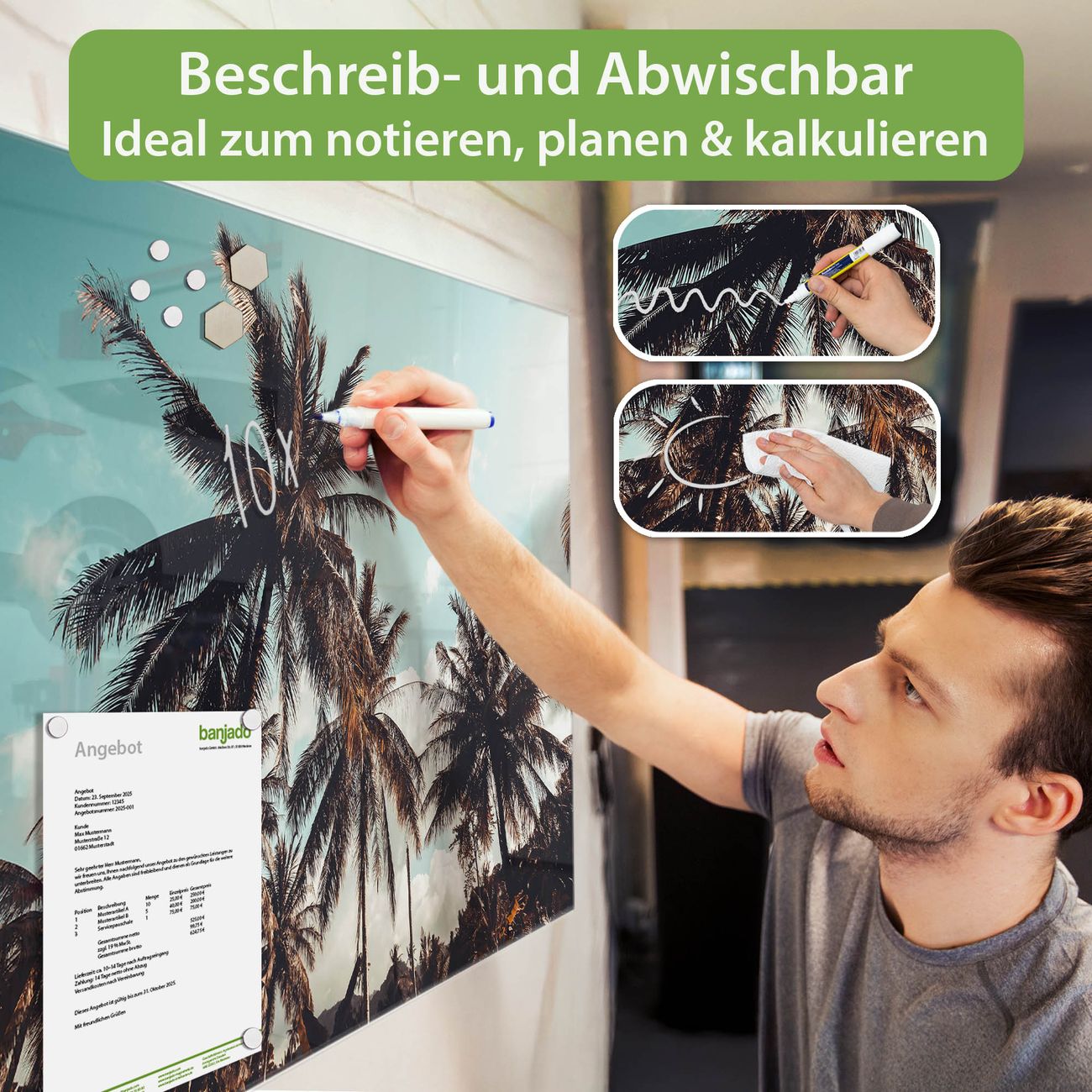 Die banjado Glas Magnettafel mit dem Motiv Motiv Unter Palmen verbindet Funktionalität mit Stil. Sie ersetzt das Zettelchaos durch klare Strukturen und bringt dabei eine warme, natürliche Atmosphäre in Ihr Zuhause. Ob im Büro, in der Küche oder im Eingangsbereich - dieses Design-Board zieht Blicke an und sorgt für Ordnung mit Charakter.